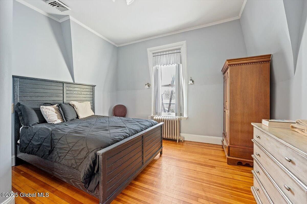 This serene bedroom features soft gray walls and gleaming hardwood floors, creating an inviting and calming ambiance. The central focus is a substantial black wooden bed, adorned with plush neutral bedding for a restful escape. Natural light pours in through a tall, elegantly framed window with sheer curtains, balanced by twin wall-mounted sconces for evening reading. Classic white trim adds architectural detail, while a mix of wooden furniture, including a large armoire and a matching dresser, speaks to timeless comfort. The uncluttered layout provides ample space for play or movement, making it perfect for families seeking both practicality and style.