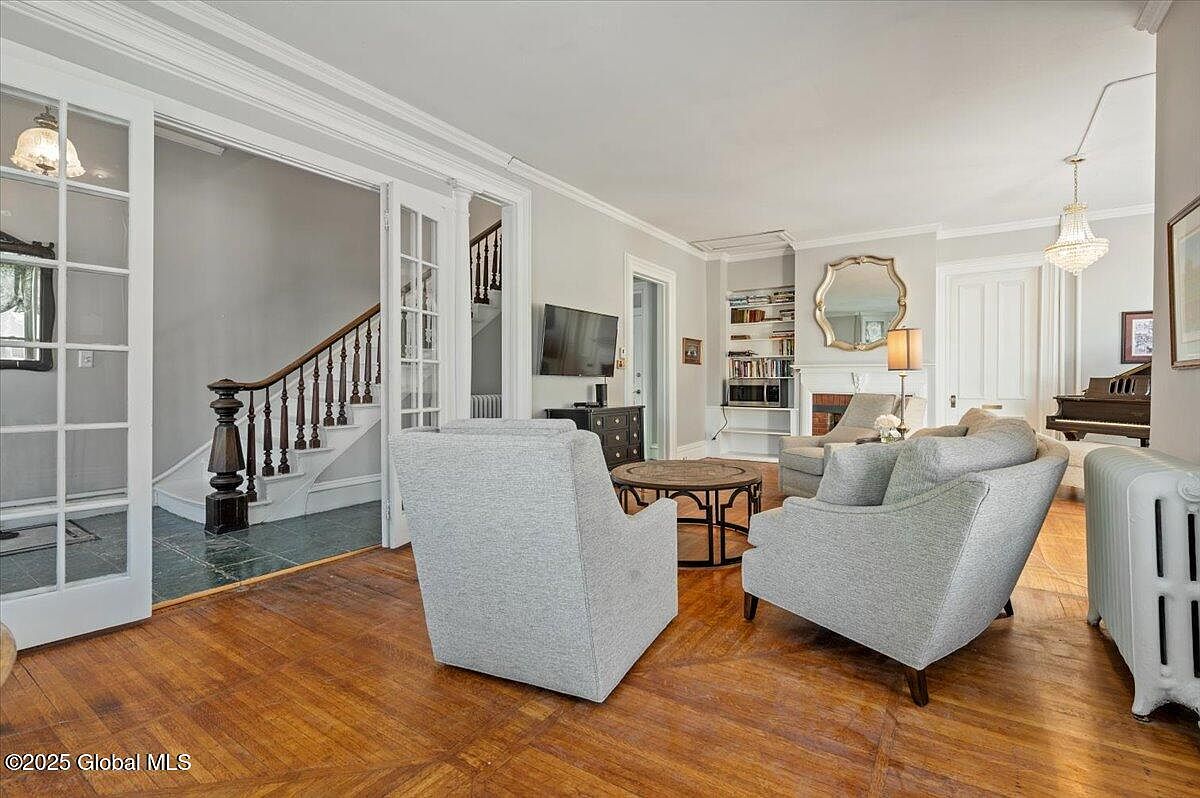 This inviting living room blends classic charm with modern comfort, featuring sleek gray sofas and armchairs arranged around a round coffee table. Beautiful hardwood floors add warmth, while large French doors open to a stately staircase, enhancing the home’s spacious feel. Family-friendly touches include built-in bookshelves for games and books, and an upright piano ideal for gatherings. Soft neutral walls, ornate trim, and a decorative mirror above the fireplace elevate the space. Natural light pours in through large windows, complemented by a statement chandelier. The airy, open layout encourages relaxation and family connection in this elegant and practical setting.