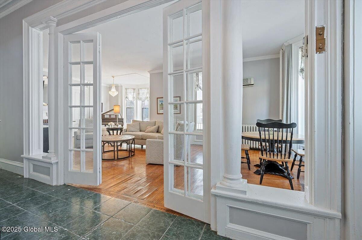 A grand set of French doors bordered by classic white columns opens into a spacious living room, welcoming guests with timeless elegance. The room features warm wood floors and a soft neutral color palette of light grays and creams, exuding a calm, family-friendly atmosphere. Luxurious beige sofas are gathered around a central coffee table, perfect for family gatherings or entertaining friends. Large windows bathe the space in natural light, while subtle traditional details like crown moldings and radiator heating add character. Adjacent, a round dining table with classic black chairs offers a cozy nook for meals or homework sessions.