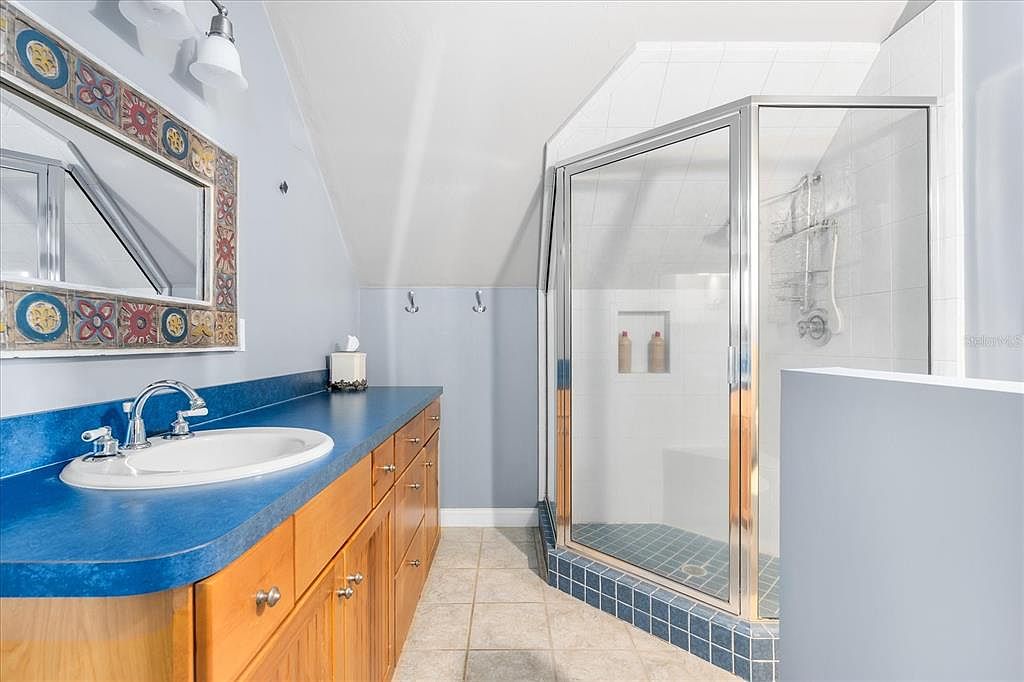A bright, spacious bathroom features a functional layout with a bold blue countertop atop warm wood cabinetry, paired with a charming, patterned framed mirror above the sink. The glass-enclosed walk-in shower sits in a corner, designed with clean white tiles and a practical bench, making it suitable for all ages. Practical hooks and storage nooks within the shower offer family-friendly convenience. The soothing pale blue wall color gives the space a calming, fresh ambiance, complemented by soft lighting from contemporary fixtures. Tiled floors provide durability, while the generous vanity counter invites shared use and organization.