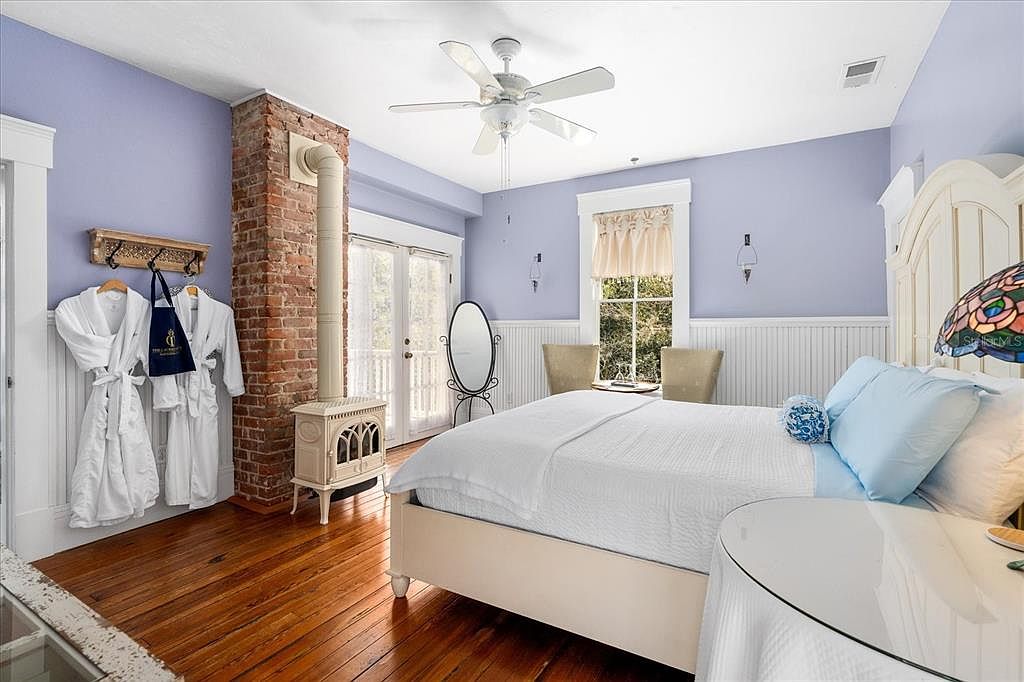 Bright and inviting, this bedroom features soothing lavender walls paired with crisp white wainscoting and classic trim details. Warm, polished hardwood floors add character, complemented by a striking exposed brick chimney and a traditional white stove for extra charm. The space feels airy from generous windows and French doors that lead outdoors, creating seamless indoor-outdoor living. Family-friendly touches include plush robes, ample natural light, and soft bedding with pastel accents. A pair of armchairs by the window provides a perfect reading nook, while a stained glass lamp adds an artistic, whimsical note for a welcoming and relaxing atmosphere.