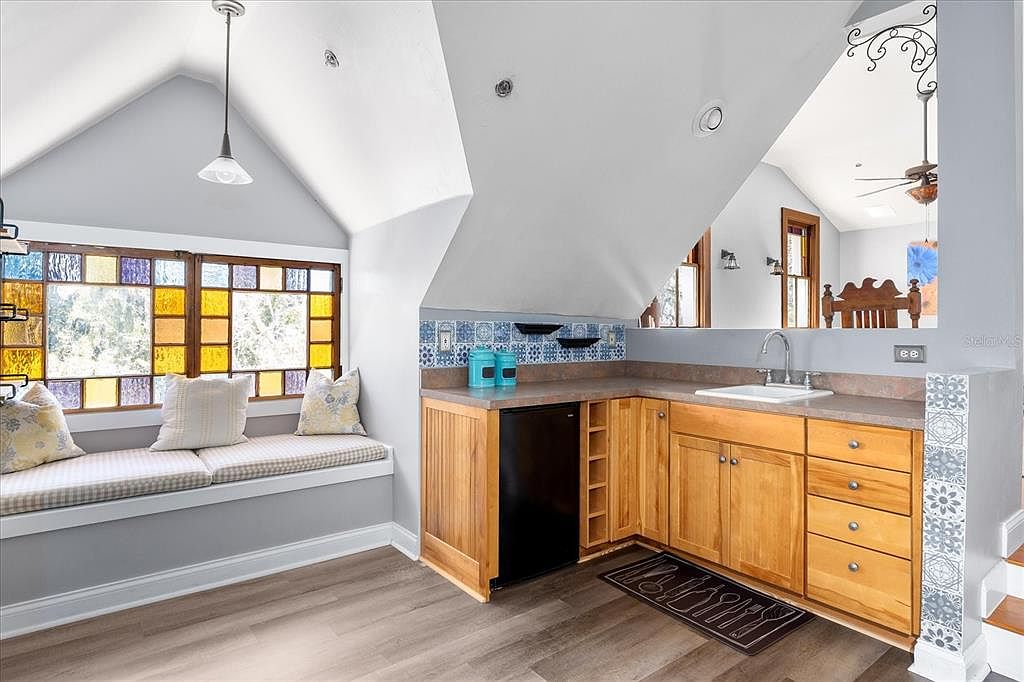A charming corner kitchen area featuring warm honey-wood cabinetry with ample storage and a compact wine fridge set against patterned blue and white accent tiles. The angled ceiling architecture adds a cozy, cottage-style appeal. Beside the sink, a long window seat framed by stunning, multicolored stained glass windows creates an inviting spot for family reading or relaxation. Soft, neutral wall tones and matching light upholstery with delicate floral pillows enhance the airy ambiance. Light wood flooring ties the space together, making it both functional and family-friendly, perfect for casual meals, crafting, or enjoying morning sunshine.