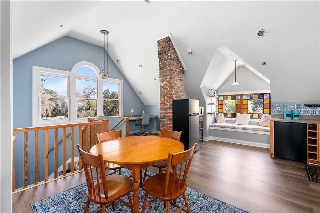 A bright, inviting space with a round wooden dining table and four chairs sits atop wood flooring, anchored by a textured blue rug. The area features cathedral ceilings with crisp white paint and soft blue accent walls, enhancing natural light from large arched windows. An exposed brick chimney adds rustic charm, while a cozy built-in window seat with plush cushions and colorful stained glass panes offers a perfect reading or family hangout spot. The open layout includes a compact kitchen area with modern amenities, blending convenience and warmth for family meals and gatherings, ideal for relaxation or entertaining guests.