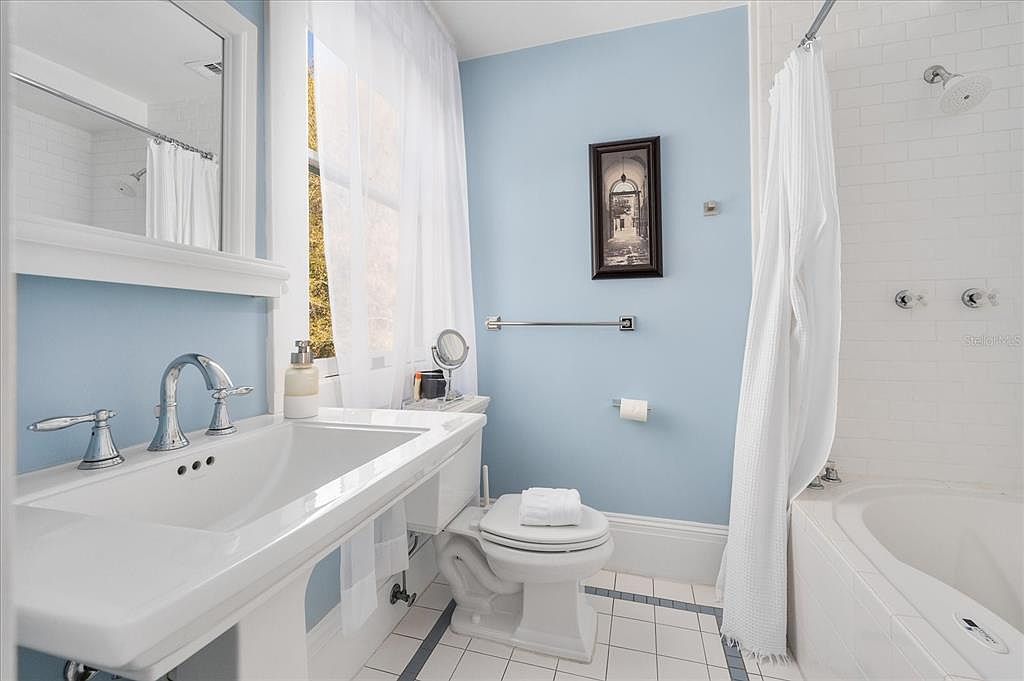 This bathroom creates a welcoming and calming atmosphere with its soft blue walls, crisp white fixtures, and abundant natural light filtering through sheer curtains. A wide porcelain sink with chrome faucets sits under a large mirrored cabinet, providing both elegance and functionality for families. The bathtub features classic white subway tiles and a curved shower curtain rod for extra space, ideal for young children or relaxing baths. The room’s layout maximizes efficiency without feeling cramped, while details like the framed wall art and neatly folded towels add a touch of sophistication. Clean lines and a simple color palette promote a fresh, serene environment.