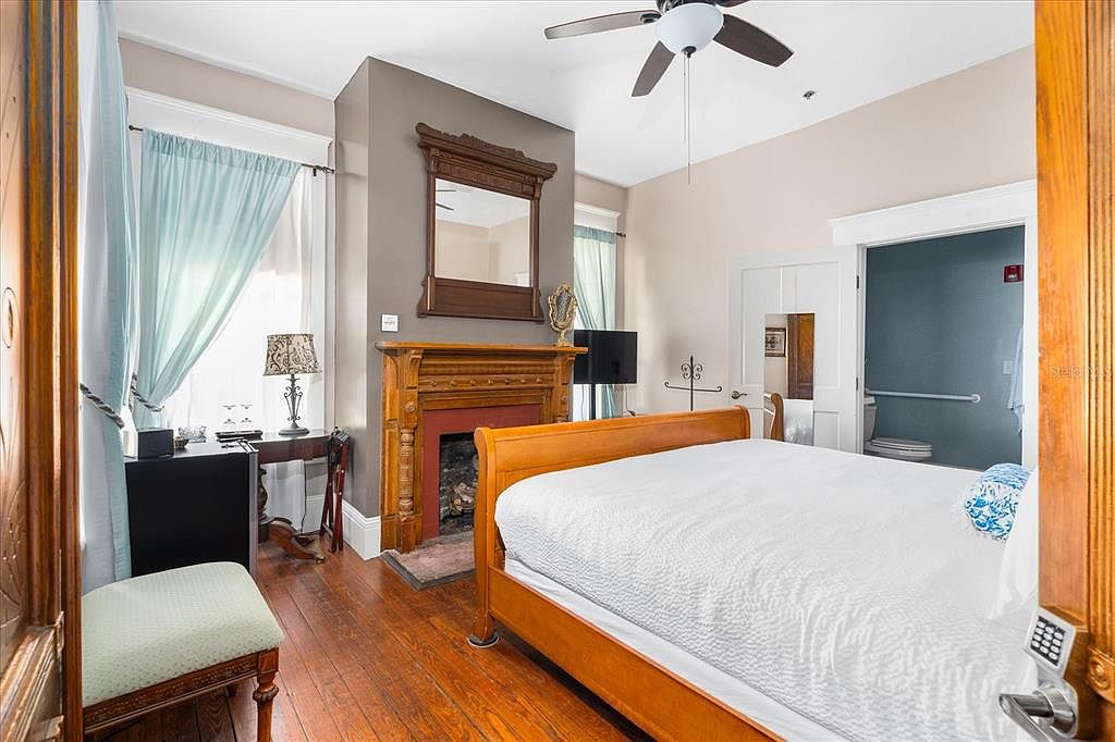 Warm hardwood floors and classic wood furnishings create a feeling of welcome in this inviting bedroom. A stately wooden sleigh bed anchors the space, positioned opposite a beautifully detailed fireplace with a carved mantle and a vintage-style mirror above. Soft pastel curtains frame tall windows, bathing the room in natural light while offering privacy and an airy touch. Tasteful family-friendly details include a seating nook, sturdy side tables, and a ceiling fan for comfort. Pale neutral walls and muted blue accents foster relaxation, while traditional trim and mouldings showcase architectural charm ideal for both relaxation and family living.