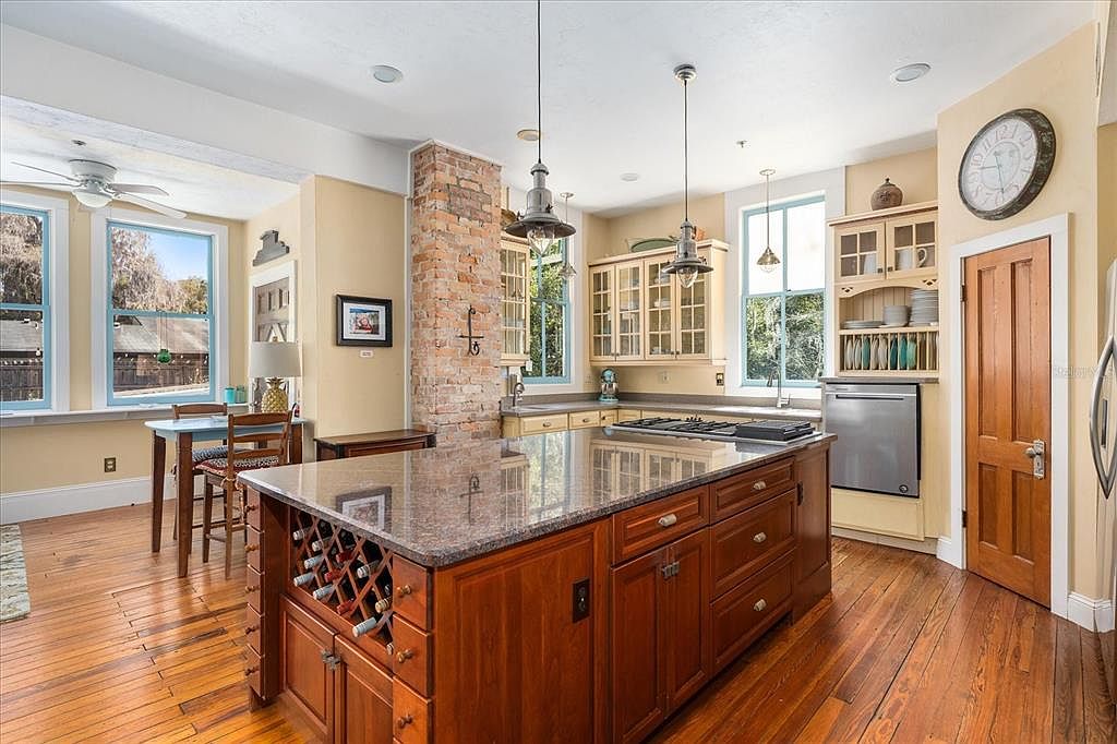 Warm wood tones and abundant sunlight create a welcoming, family-friendly kitchen. The spacious central island offers granite countertops, plenty of storage, and built-in wine racks, making it perfect for cooking, homework, or casual meals. A brick accent column divides the workspace efficiently while adding rustic charm. The kitchen features glass-front upper cabinets, open shelving for easy access to plates and dishes, and stainless steel appliances. Light yellow walls complement the gleaming hardwood floors and large windows, which provide natural light and a view of the backyard. Modern pendant lights add a touch of elegance to this inviting, functional space.