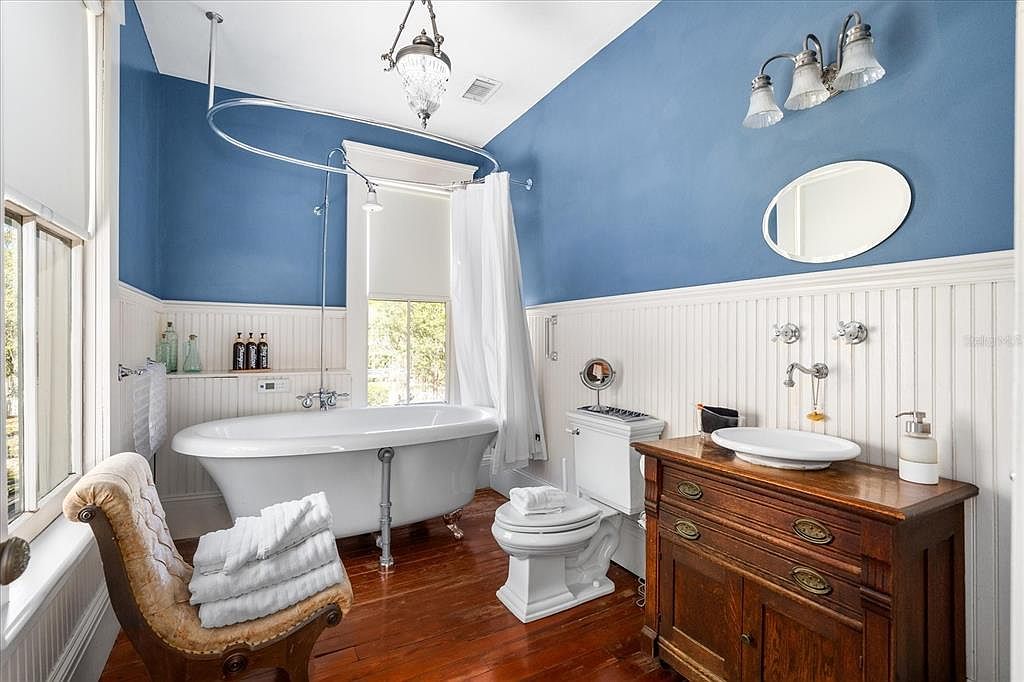 A beautifully restored bathroom features a classic clawfoot soaking tub set against beadboard wainscoting and soothing blue upper walls. Natural light pours in through large windows, creating a warm, inviting space. Family-friendly amenities include an elegant wooden vanity with ample storage, a modern vessel sink, and practical shelving for essentials. The polished wood floors add rustic charm, while the plush armchair and neatly folded towels infuse comfort and luxury. Thoughtful finishing touches, such as a vintage-style chandelier, chrome fixtures, and decorative lighting, enhance the timeless elegance and functional design of this tranquil retreat, perfect for relaxing at home.