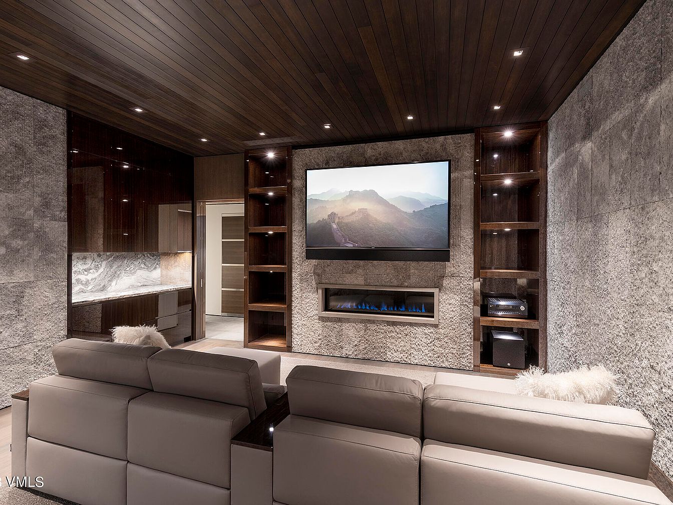 A sophisticated home theater lounge designed for family comfort, featuring plush leather sectional seating that invites everyone to relax and enjoy movie nights together. The space boasts a modern, cozy atmosphere with textured stone walls and a warm, wood-paneled ceiling fitted with recessed lighting for a gentle, cinematic ambiance. Built-in shelving flanks a large flat-screen TV and contemporary electric fireplace, perfect for storing games, books, and electronics, making the space versatile for all ages. Rich walnut cabinetry, polished marble backsplash, and soft accent pillows add luxurious yet family-friendly touches to this inviting entertainment retreat.