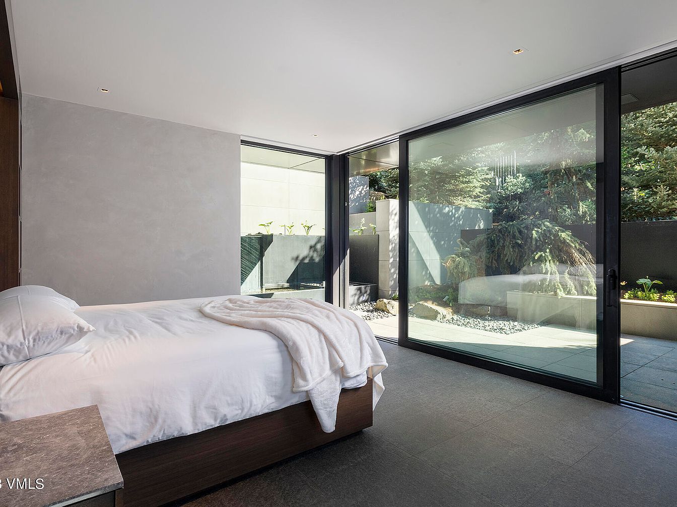 A spacious bedroom features expansive floor-to-ceiling glass doors that fill the space with natural light and showcase a tranquil garden patio right outside. The neutral color palette of soft grays and whites enhances the serene atmosphere, while sleek minimalist furnishings, including a modern bed and stone-topped side table, create a calming retreat. The seamless connection to the outdoor area invites peaceful relaxation and play, offering a safe space for children and family members. Clean lines, unobtrusive lighting, and uncluttered surfaces highlight the contemporary architectural style, blending indoor comfort with nature-inspired aesthetics.