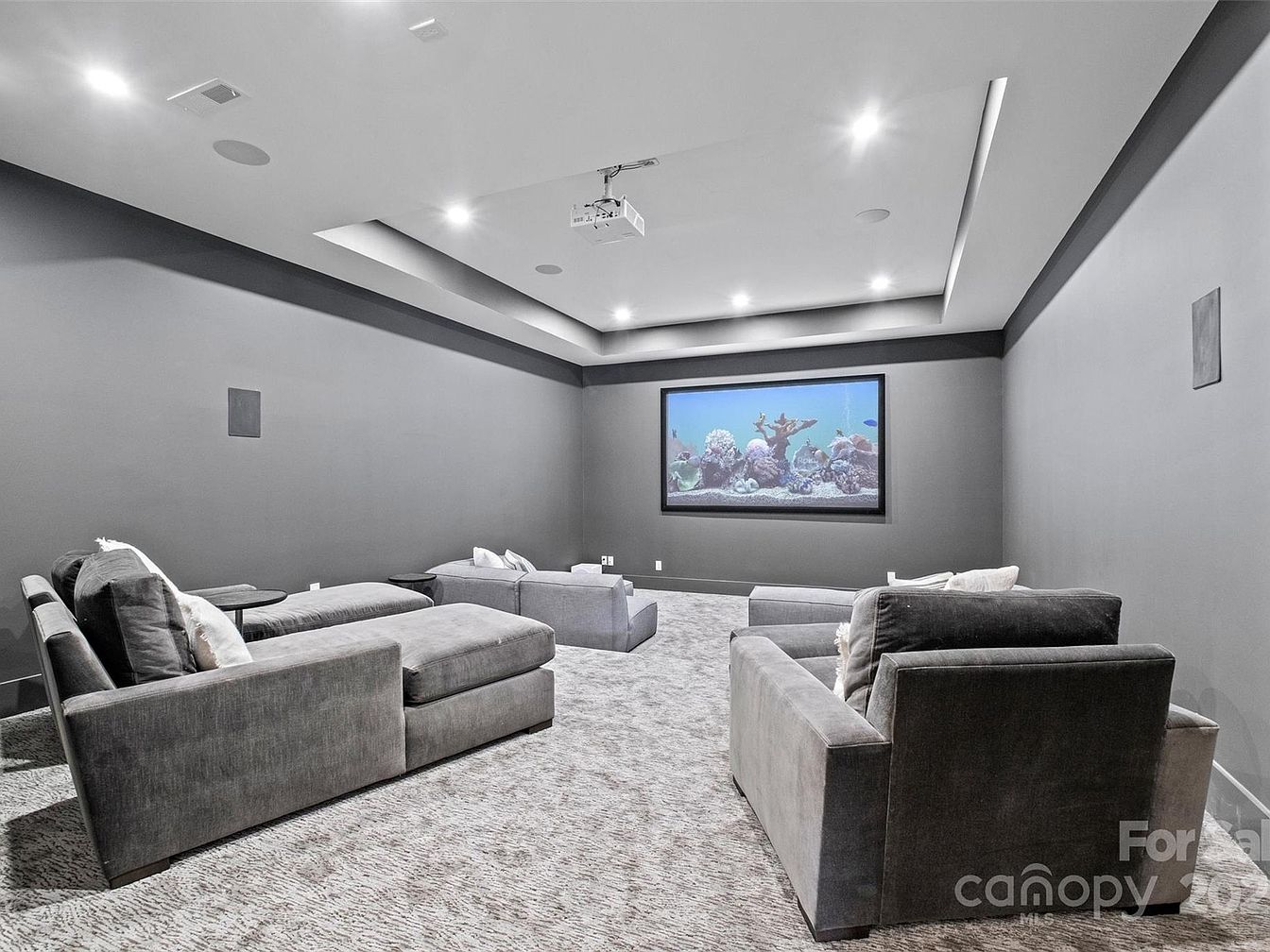 A sleek and inviting home theater room features a modern layout perfect for family movie nights or entertaining friends. Plush, deep gray sectional sofas are arranged for optimal viewing of the large, wall-mounted screen, while soft carpeting enhances comfort and acoustics. The tray ceiling design, subtle recessed lighting, and sound-absorbing dark walls contribute to an immersive cinematic experience. Tasteful minimalist decor keeps the space uncluttered and welcoming, making it ideal for families with children or guests. Neutral tones create a calming environment, blending stylish sophistication with practical comfort for hours of relaxation and shared enjoyment.