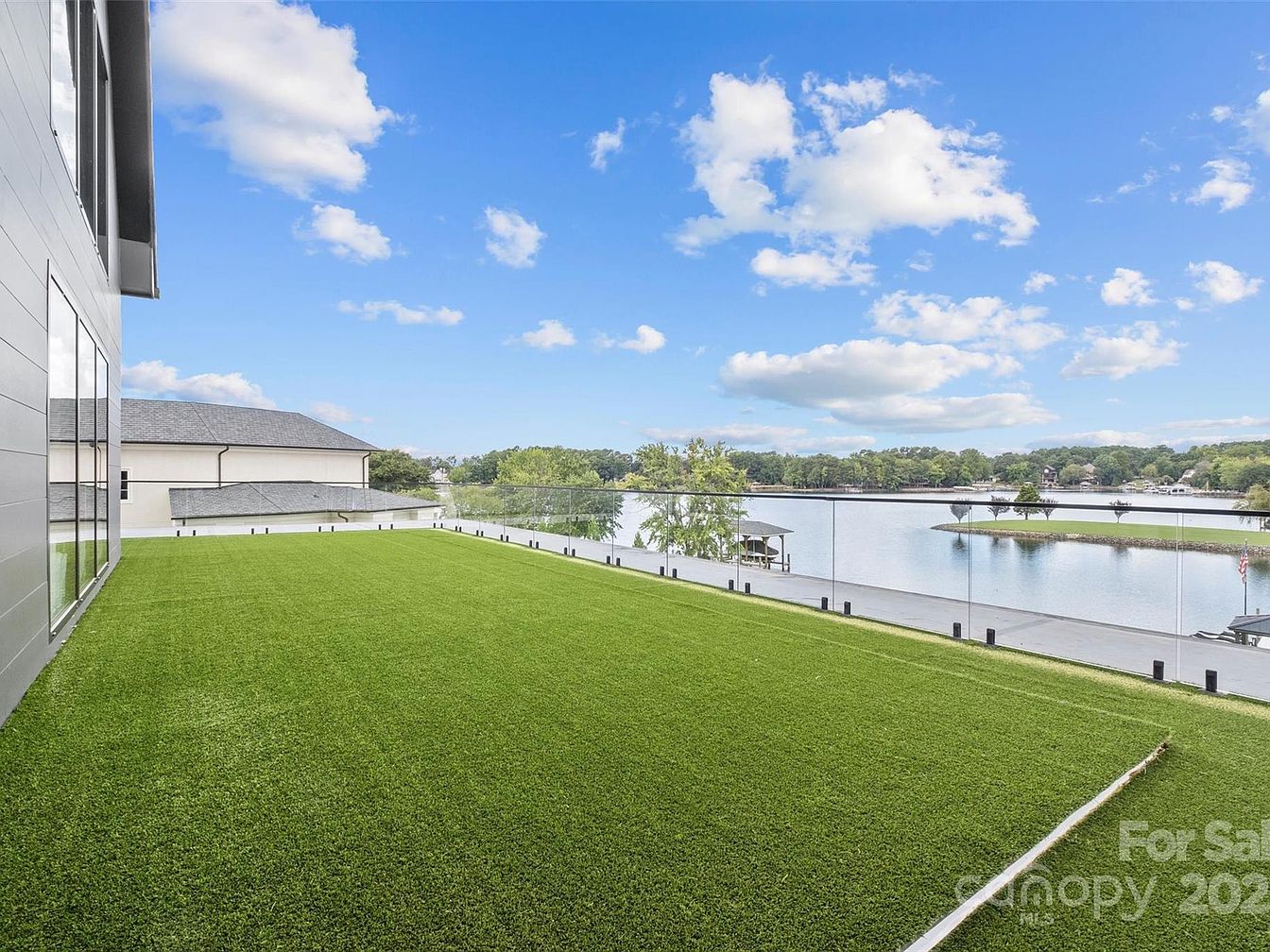 An expansive terrace features a lush green lawn with immaculate artificial turf, perfect for family games and outdoor gatherings. The clear glass railing offers uninterrupted views of the serene lake and surrounding landscape, enhancing both safety and style. Modern architectural lines of the adjacent home blend seamlessly with the bright, open sky, while the well-proportioned space invites children and pets to play freely. The sleek, minimalist design and soothing natural palette create a tranquil retreat, making this terrace ideal for family relaxation, sunset watching, or entertaining friends against a beautiful waterfront backdrop.