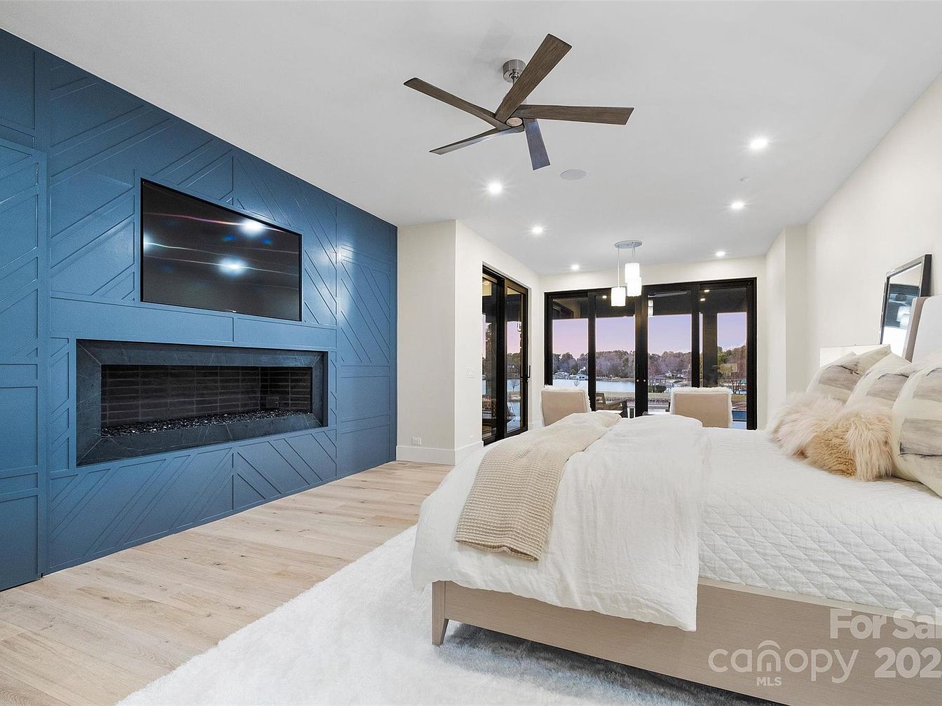A spacious master bedroom displays modern elegance and comfort, perfect for family relaxation and unwinding. The focal point is a bold navy accent wall featuring a linear, built-in fireplace and a mounted flat-screen TV, making it ideal for cozy evenings. Light wood flooring complements the soft, neutral furnishings, including a plush white area rug and a king-size bed adorned with textured pillows and throws. Large glass doors at the far end open up to an outdoor view, emphasizing natural light and effortless indoor-outdoor flow. A sitting area adds versatility, allowing space for reading, family time, or quiet reflection.