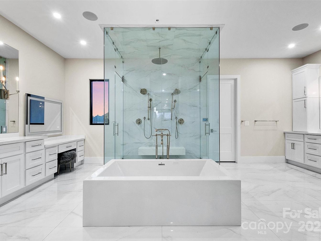 A luxurious bathroom exuding contemporary elegance, with an open and spacious layout featuring a central freestanding soaking tub enclosed within a glass-walled shower. The space is adorned in a crisp white color palette, complemented by sleek marble-look flooring and ample built-in cabinetry for storage. Vanity areas with generous counter space and dual mirrors provide convenience for families, while the plush stool adds a touch of comfort. Large glass panels promote an airy feel and natural light, making this an inviting sanctuary for relaxation and family routines. Advanced fixtures and thoughtful design reflect both modern aesthetics and practical livability.