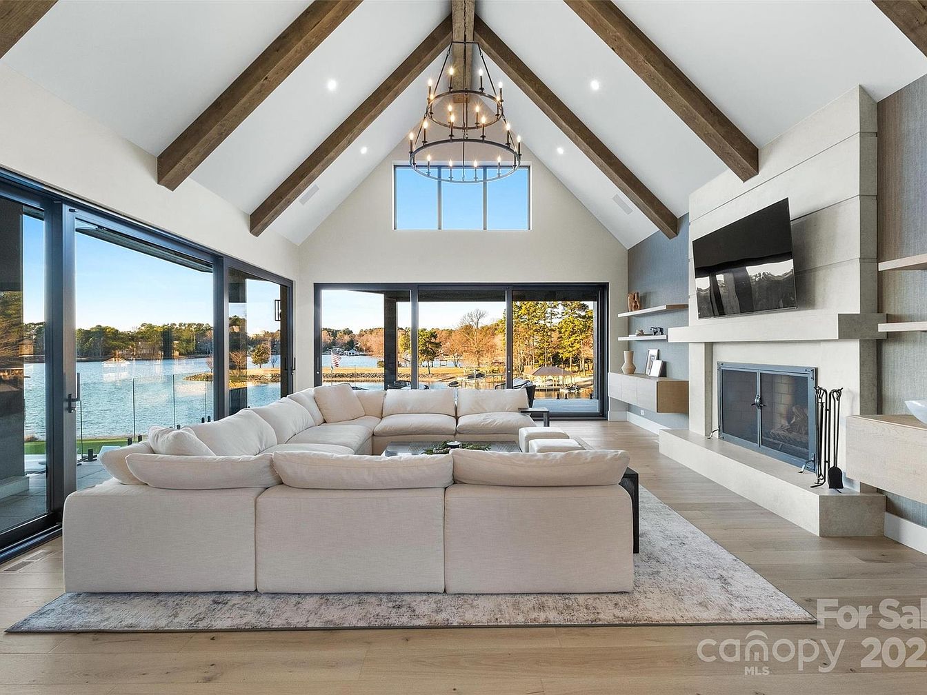 A spacious living room with soaring vaulted ceilings and exposed wood beams creates an inviting, open atmosphere perfect for family gatherings. Expansive glass doors and windows frame breathtaking lake views while flooding the space with natural light. A plush L-shaped sectional sofa offers ample, comfortable seating for both adults and children, arranged around a modern stone fireplace and entertainment center. Soft neutral tones throughout the furnishing and wide-plank wood flooring add warmth and elegance. Floating shelves and sleek built-in cabinetry provide functional style without clutter, making this space ideal for relaxing, entertaining, and enjoying the natural surroundings with loved ones.