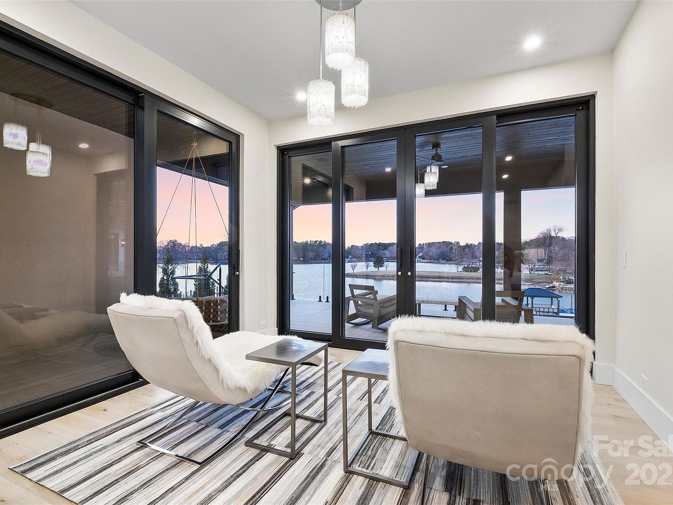 A serene sitting area offers a perfect spot for relaxation and conversation, facing large floor-to-ceiling sliding glass doors that provide uninterrupted views of the lake. The space is anchored by two contemporary, plush armchairs draped in soft, white faux fur, placed atop a striped area rug with neutral tones that complement the light hardwood floors. Minimalist side tables sit between the chairs, ideal for holding drinks or books. Pendant lighting overhead adds ambiance to the tranquil aesthetic, while the clean lines and neutral color palette create a modern, family-friendly retreat ideal for quiet evenings or informal gatherings.