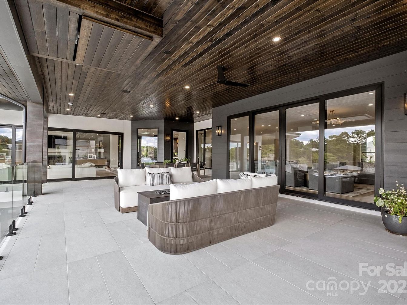 This sophisticated outdoor living area offers an inviting space perfect for both relaxation and entertaining. The covered patio features rich, dark wood ceilings with recessed lighting and ceiling fans, adding warmth and elegance to the space. Expansive glass doors provide seamless access to the adjoining indoor spaces, promoting an open and connected feel throughout the home. Soft, neutral-toned sectional seating is arranged around a sleek modern fire table, creating a cozy atmosphere for family gatherings. Light gray tile flooring is durable and easy to maintain, while potted greenery adds a natural touch, making it ideal for families to enjoy outdoor time together in comfort.