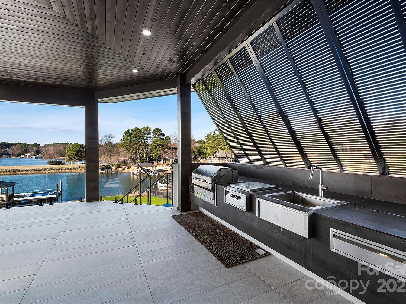 A sleek lakeside outdoor kitchen combines modern design with family-friendly functionality. Spacious countertops and stainless steel appliances line one wall, including a built-in grill, dual burners, and deep sink, perfect for entertaining and alfresco dining. The covered ceiling with recessed lighting provides ample shade and comfort, while wide porcelain tile flooring ensures easy cleaning. Black metal accents and bold slatted panels create a contemporary feel, enhancing privacy without sacrificing the stunning views of the water and dock below. Ample open space and safety rails make this area inviting and safe for families to gather and enjoy outdoor living together.