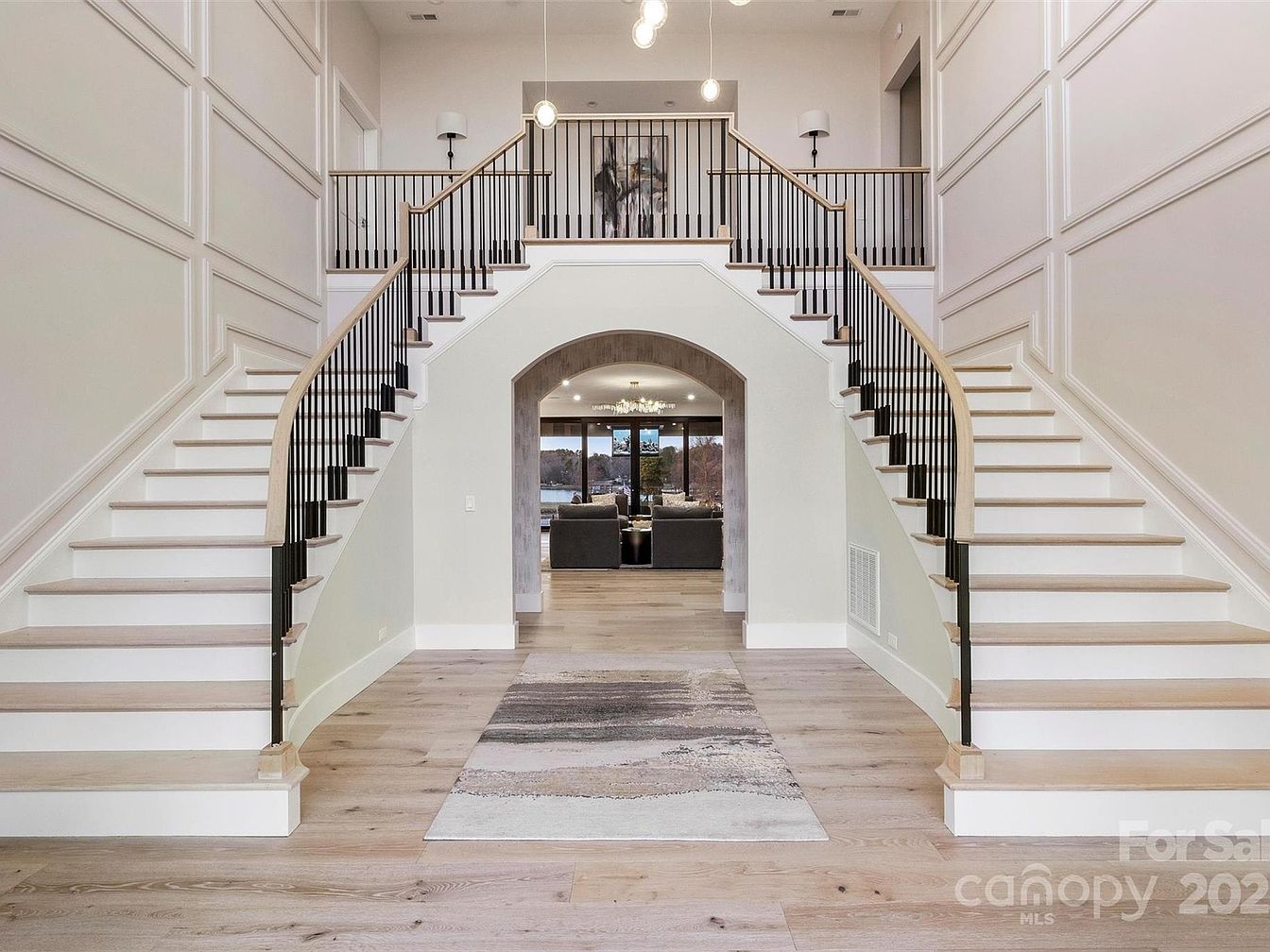 A stunning double staircase greets you at the home’s entrance, setting a stately and welcoming tone. Tall, paneled walls in soft neutrals amplify the soaring ceilings, while modern pendant lighting creates an inviting ambiance. Blonde wood stairs with black metal railings combine classic and contemporary styles, making the space feel fresh yet timeless. The light oak flooring extends throughout the open floor plan, seamlessly connecting to the living area beyond. A plush area rug in the center offers comfort and defines the space, perfect for families with children or guests. The open sightline and wide archway ensure easy, efficient flow throughout the home.