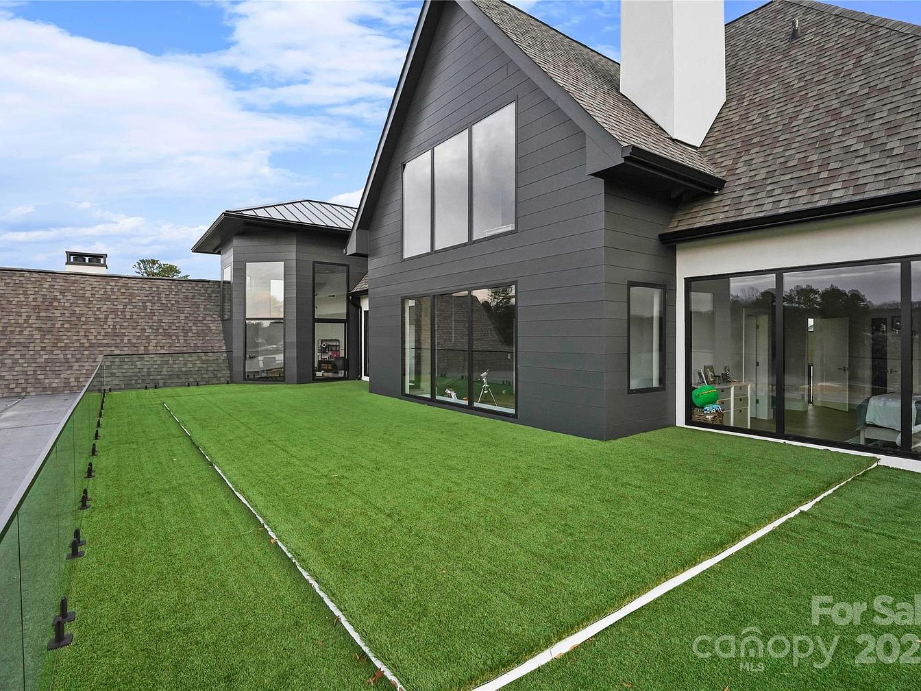 A spacious rooftop lawn terrace blends modern architectural lines with a practical family-friendly green space. The synthetic turf offers a safe and soft area for children to play while parents can relax nearby, all surrounded by sleek glass railings that ensure both safety and visibility. Large glass doors seamlessly connect the interior living spaces with the terrace, encouraging indoor-outdoor flow and filling adjacent rooms with natural light. The dark exterior siding and sharply peaked rooflines create eye-catching contrast against the vivid green grass and blue sky, resulting in a contemporary and inviting outdoor zone perfect for entertainment and relaxation.