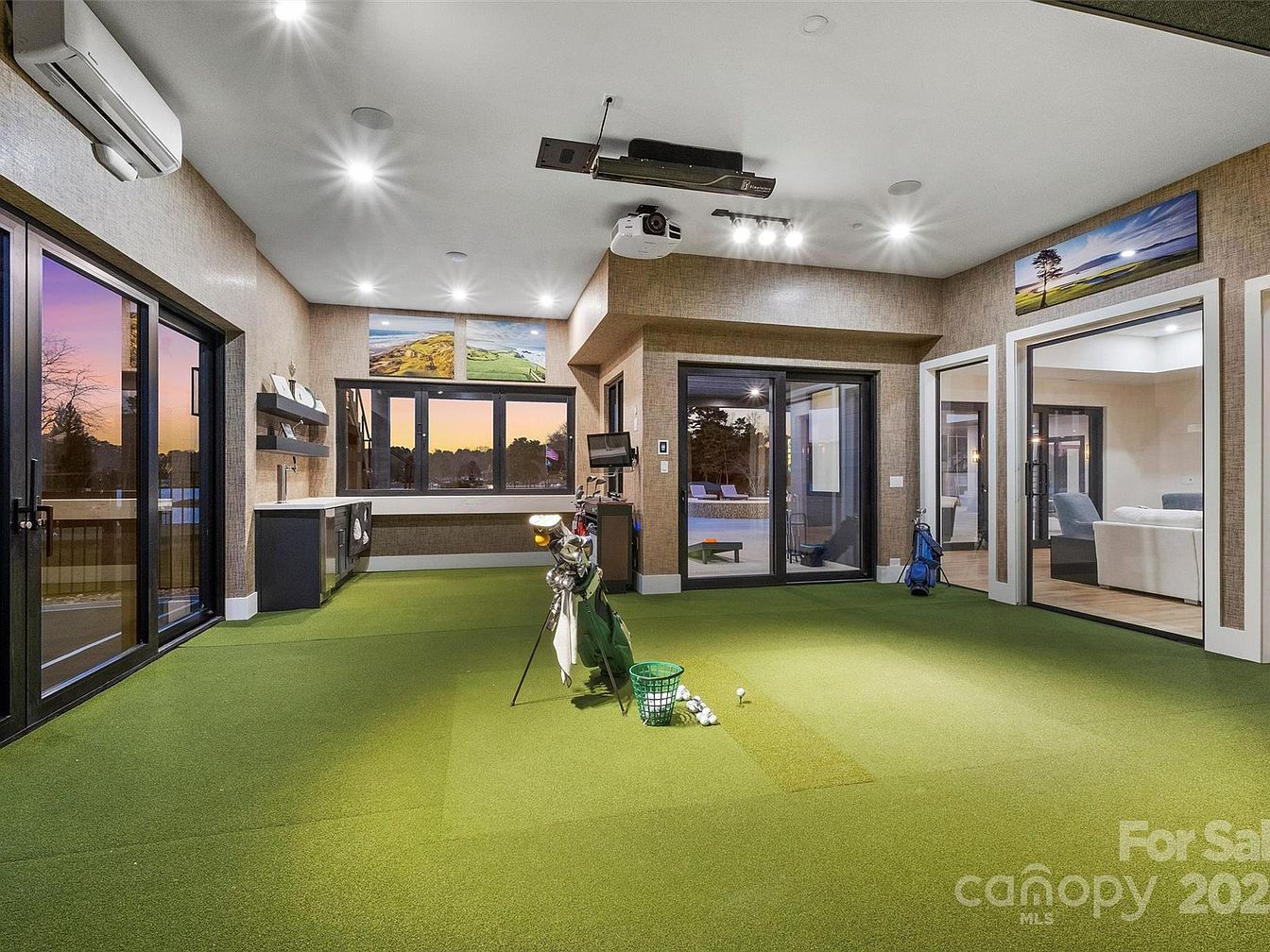 A state-of-the-art indoor golf simulator room perfect for sports enthusiasts and family entertainment, offering a spacious layout with full wall-to-wall green turf that mimics the look and feel of a putting green. Large, floor-to-ceiling windows and sliding glass doors provide stunning natural light and connect this versatile space to adjacent rooms and outdoor areas. Textured taupe walls bring warmth and elegance, while golf-themed artwork adds character. Modern ceiling lighting and a top-notch projector system equip the room for immersive practice sessions or group activities. Built-in shelving and a sleek countertop create an organized, family-friendly environment suitable for all ages.