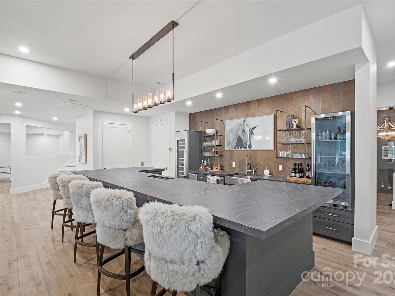 A stunning home bar blends contemporary design with inviting comfort, perfect for family gatherings and entertaining guests. The spacious L-shaped countertop is crafted from elegant dark stone, providing ample seating with plush barstools draped in soft, faux fur for a cozy feel. Natural wood flooring extends warmth throughout the area, complementing the chevron-patterned wood backsplash. Sleek cabinetry, open shelving for glassware, and a stainless steel under-mount sink add functionality and sophistication. Pops of personality appear in curated décor and artwork, while a statement pendant light illuminates the space. The open layout and easy access make this a welcoming, family-friendly retreat.