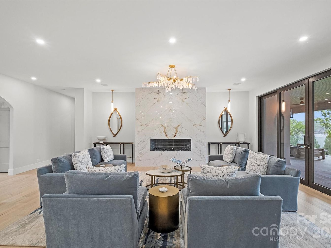 This modern living room features a symmetrical layout with four plush, slate-blue armchairs arranged around a circular coffee table, encouraging conversation and family gatherings. The light wood flooring adds warmth and openness, while expansive glass doors flood the space with natural light and offer seamless access to a covered patio, perfect for indoor-outdoor living. A striking marble fireplace acts as the focal point, flanked by sleek accent tables, artistic mirrors, and sculptural pendant lights for an elegant touch. The neutral color scheme with gold accents creates a soothing, sophisticated atmosphere ideal for family relaxation or entertaining guests.