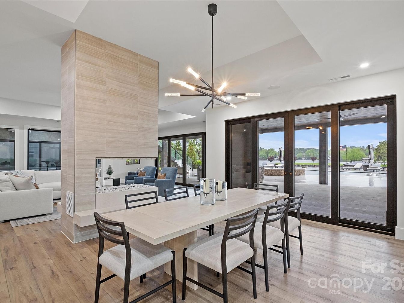 A contemporary dining area seamlessly connects to the outdoor patio through expansive glass doors, providing beautiful views and plenty of natural light. The open-concept space features a light wood dining table with modern black chairs, complemented by an elegant geometric chandelier for a sophisticated touch. Warm wood plank flooring enhances the inviting atmosphere. The space is anchored by a double-sided fireplace clad in light tile, dividing the dining and living spaces without closing them off. This family-friendly layout allows for easy interaction and supervision, ideal for gatherings and everyday comfort, while neutral tones create a calming, cohesive aesthetic.