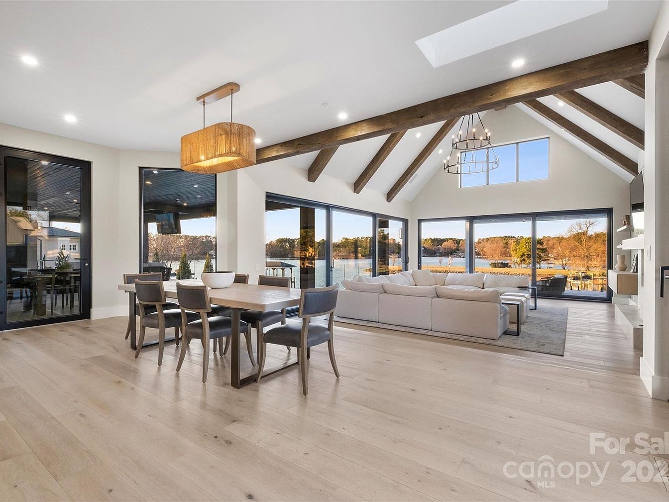 This stunning open concept living and dining area boasts soaring vaulted ceilings with exposed wood beams, creating a sense of spaciousness and warmth. Wide plank light oak flooring sets a natural, inviting tone, complemented by expansive windows that flood the space with natural light and offer picturesque lake views. A large, cozy sectional seating area is ideal for family gatherings, while the modern dining table and contemporary chairs welcome shared meals. Family-friendly features include uncluttered sight lines and ample space for movement. Neutral tones, statement lighting fixtures, and sleek built-in shelving add to the elegant, modern yet comfortable atmosphere.