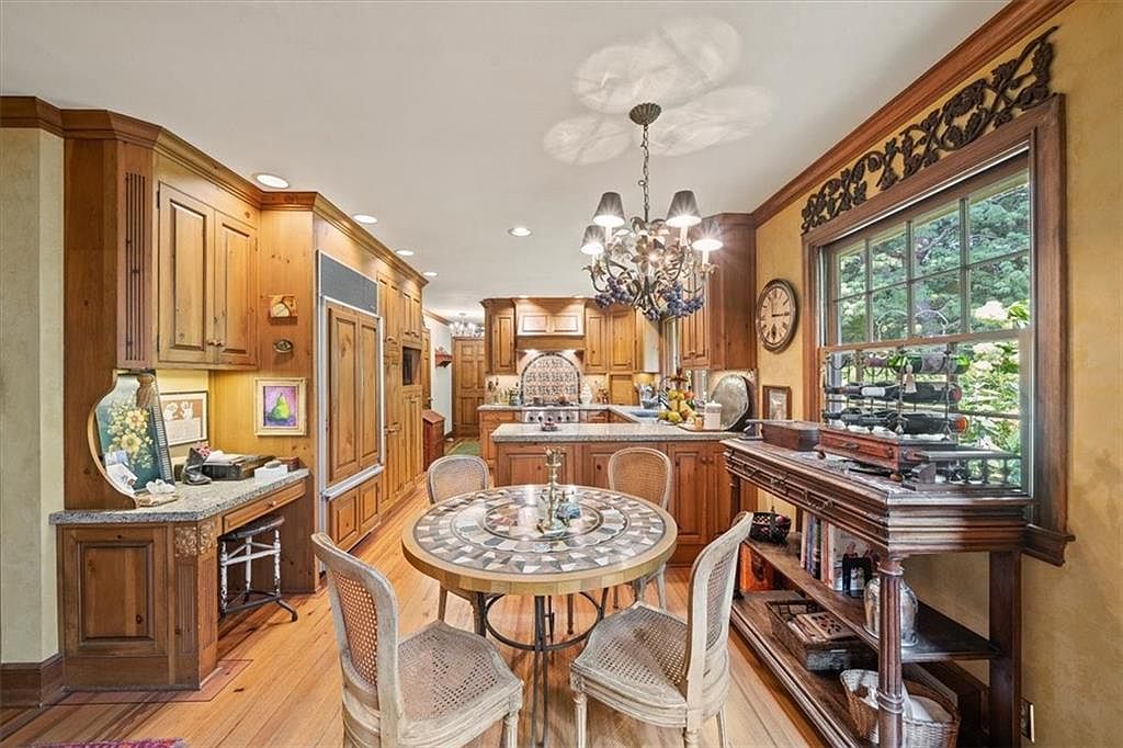 Warm wood cabinetry and trim give this kitchen and breakfast nook a welcoming, traditional feel, perfect for family gatherings. The cozy round dining table, surrounded by cane-back chairs, encourages casual meals together. Large windows flood the space with natural light, highlighting rustic design accents such as a sculpted chandelier, ornate wall carving, and vintage-style clock. Open shelving and built-ins provide both storage and display space for books, collector’s items, and cookware, making it both practical and inviting. The golden hues paired with detailed woodwork create a charming, family-friendly atmosphere ideal for daily living and entertaining.