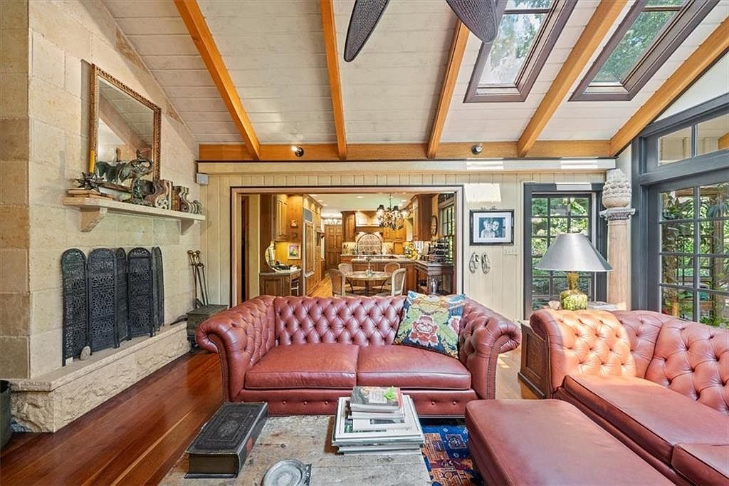 Warmth and natural light fill this living room, which opens seamlessly to the adjacent kitchen, making it ideal for family gatherings and entertaining. Exposed wooden beams and skylights create a bright, airy atmosphere, while the rich red Chesterfield leather sofas provide both comfort and a touch of classic elegance. A stone fireplace with decorative metal screen anchors the room, and eclectic decor, including modern art and whimsical cushions, adds charm. The hardwood floors and traditional area rug give a welcoming, durable foundation for active households. Large windows and French doors invite the outdoors in, offering lovely views and easy backyard access.
