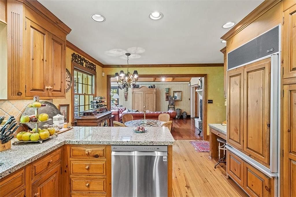 A warm and inviting kitchen seamlessly connects to a cozy dining nook and an adjacent living area, creating an open and family-friendly layout. Granite countertops and natural wood cabinetry offer both durability and rustic charm, while stainless steel appliances add a modern touch. Large windows bathe the space in natural light, highlighting the soft yellow walls and decorative crown molding. A chandelier above the dining table brings a touch of elegance. The roomy design encourages both meal preparation and togetherness, perfect for busy families, and the visible living room beyond provides a welcoming transition between cooking, dining, and relaxing spaces.