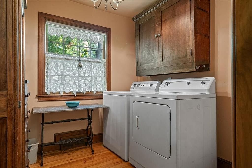 Warm peach-toned walls and honey-colored wooden trim create an inviting, practical laundry space. The washer and dryer sit side by side under a solid, rustic wooden cabinet, offering ample storage for detergents and cleaning supplies. A wooden framed window lets natural light fill the room, enhanced by charming lace curtains that add a vintage flair while maintaining privacy. The room also features a sturdy antique-style table with a decorative metal base, perfect for folding clothes or organizing laundry essentials. Hardwood floors ensure easy maintenance, making this a family-friendly, functional, and aesthetically pleasing utility area.