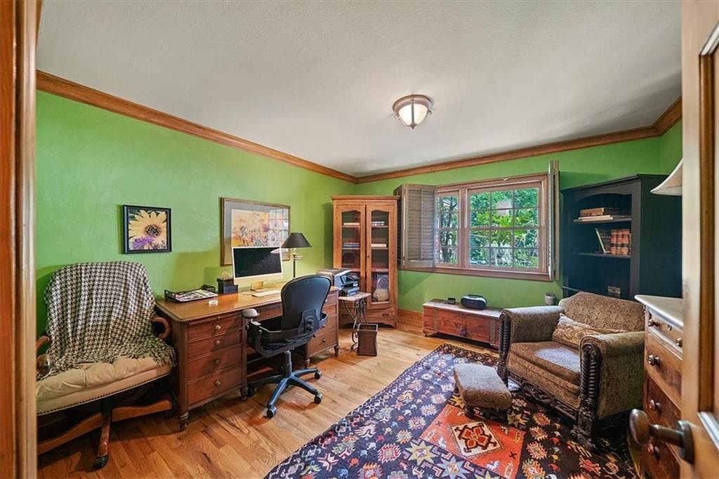 A cozy and bright home office featuring inviting green walls adorned with floral artwork and accented by natural wood trim. The room offers a spacious layout with a large desk, ergonomic office chair, and additional vintage-style seating perfect for reading or relaxing. An expansive window brings in natural light and a view of greenery outside, while ample built-in bookshelves and a glass-front cabinet provide storage for books and family treasures. Classic hardwood floors, complemented by a vibrant patterned rug, help create a warm and welcoming atmosphere ideal for work, study sessions, or quiet family moments together.