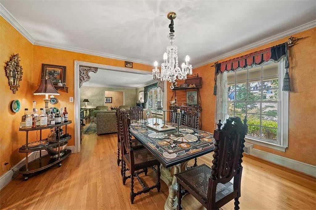 Warm ochre walls and polished hardwood floors set a welcoming tone in this charming dining room. A long, ornate table with intricate inlay is surrounded by elegant, carved wooden chairs, perfect for family gatherings or festive meals. A classic crystal chandelier adds a touch of luxury and illuminates the space beautifully. Large windows framed by decorative valances invite natural light and offer picturesque views of the garden. Thoughtfully curated art, vintage accents, and a convenient bar cart add personality while providing both style and functionality, making the room ideal for entertaining guests or enjoying special meals with loved ones.