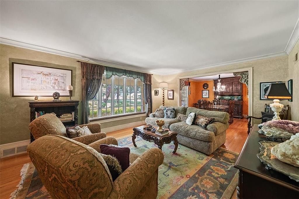 Classic charm welcomes you in this spacious living room, where large bay windows fill the area with natural light and views of a lush front yard. Richly upholstered furniture, including a generous sofa and armchairs, offer ample seating for family gatherings or cozy movie nights. Traditional details like intricate woodwork, crown molding, and an ornate coffee table enhance the timeless elegance. Earth-toned walls, a decorative area rug, and layered window treatments create a warm, inviting ambiance that suits both active families and entertaining guests. A clear line of sight into the adjoining dining room strengthens the open, family-friendly layout.