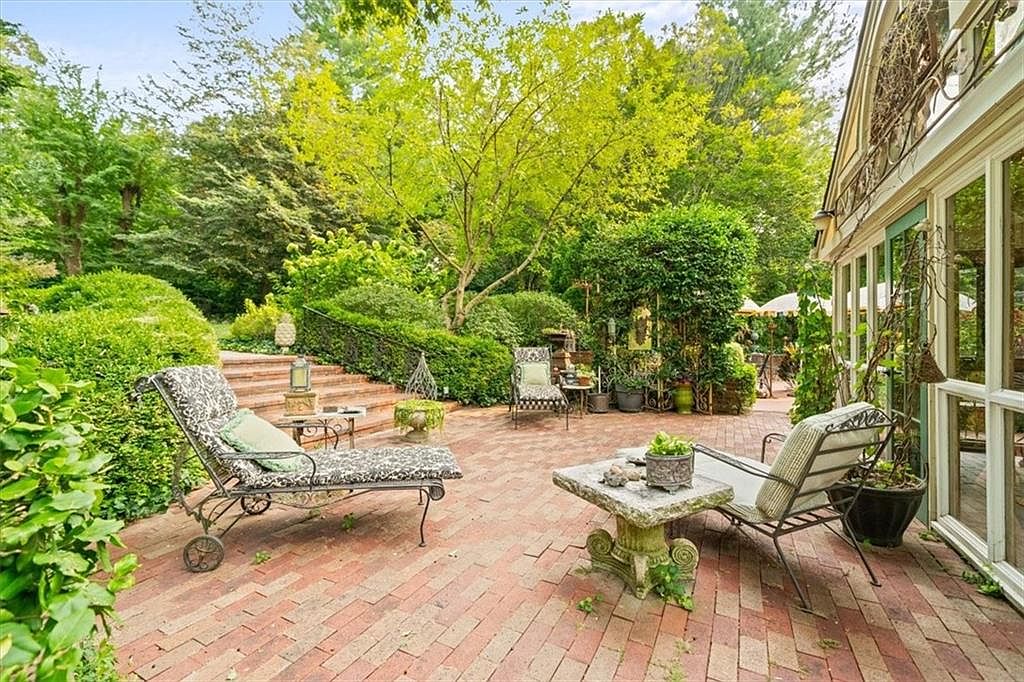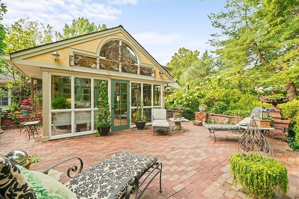 Expansive brick patio bordered by lush landscaping provides a perfect blend of relaxation and family enjoyment. Soft yellow and green tones from the sunroom’s exterior harmonize with the garden’s leafy surrounds. Multiple wrought iron lounge chairs, cushioned for comfort, create inviting spots for conversation or lounging in the sun. Planters with climbing vines and overflowing greenery add natural charm. Tall windows on the adjoining sunroom flood the area with light, while a sturdy brick retaining wall offers additional seating or display space for potted plants. This outdoor living space is ideal for gatherings, play, and serene afternoons alike.