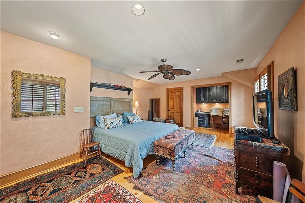 A spacious master bedroom designed with comfort and character, featuring soft peach-colored walls paired with rustic wood accents. The large bed is adorned with patterned textiles and plush pillows, set against a unique wooden headboard. Vibrant geometric rugs layer over warm wooden floors, creating a cozy yet elegant atmosphere. A ceiling fan with petal-like blades adds a tropical touch, while ample natural light filters through shuttered windows. The space includes a dedicated workspace with built-in dark cabinetry—perfect for family organization or remote work. Thoughtful details, vintage-style furniture, and ample floor space make this room adaptable for both relaxation and quality family time.