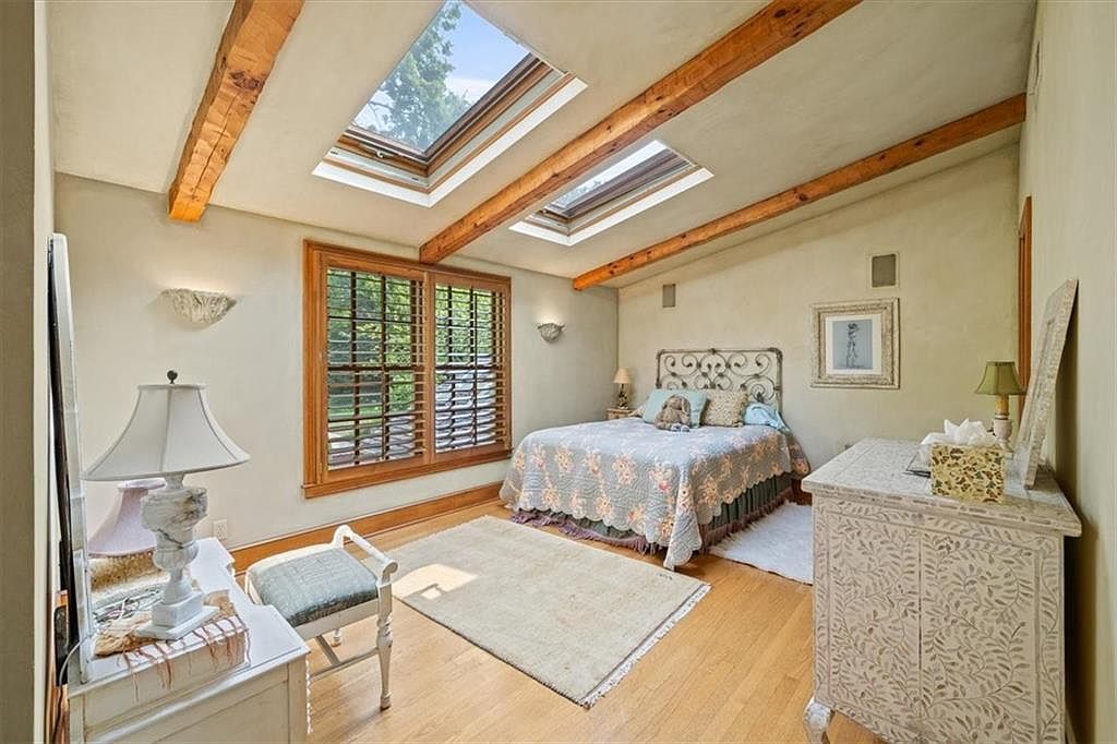 Natural light streams into this charming bedroom through skylights and large windows with wooden shutters, creating a bright and airy atmosphere. Exposed wooden beams lend rustic character, complementing the soft cream walls and pale wooden flooring. The queen bed, adorned with a patterned coverlet and plush pillows, is the focal point, making it a comfortable spot for relaxing with family. Thoughtfully placed furniture, such as an ornate dresser and bedside tables, enhance both storage and style. The neutral color palette and classic decor foster a peaceful ambiance, while the spacious layout allows room for children to play or unwind with parents.