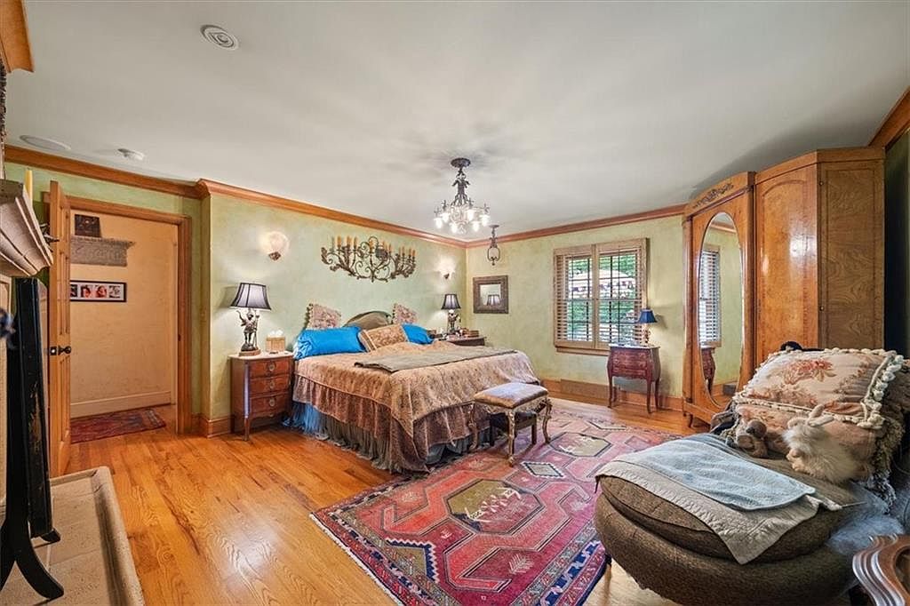 A spacious master bedroom exudes warmth and comfort, featuring hardwood floors and sage green walls accented by natural wood trim. The centerpiece is a plush bed adorned with rich linens and an array of coordinating pillows, flanked by elegant bedside tables and classic lamps. An ornate chandelier and wall sconces create a soft, inviting ambiance. An antique armoire with a mirrored door and a curved chaise lounge offer both style and practical storage. Large windows with wooden blinds allow natural light, while layered area rugs provide a cozy, family-friendly footing. Subtle vintage elements blend seamlessly with modern comfort.