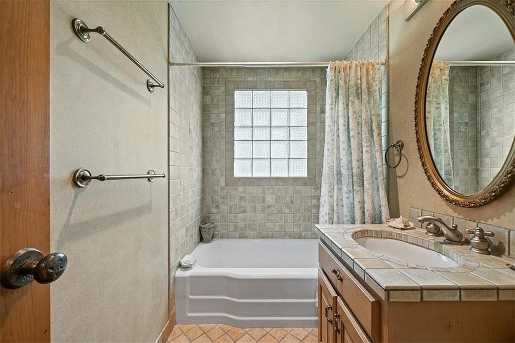 A cozy and practical bathroom showcases a timeless blend of neutral tones and warm wood accents. The space features a traditional bathtub with tile surround, enhanced by a modest patterned shower curtain for privacy. Natural light flows through a frosted glass block window, providing both brightness and privacy. The vanity has a tiled countertop and built-in sink, paired with an oval framed mirror above. Bronze hardware throughout, including twin towel bars and coordinating faucet, adds a unified look. Durable tiled flooring and easy-to-clean surfaces make this bathroom especially family-friendly, offering comfort and everyday functionality for households of all sizes.
