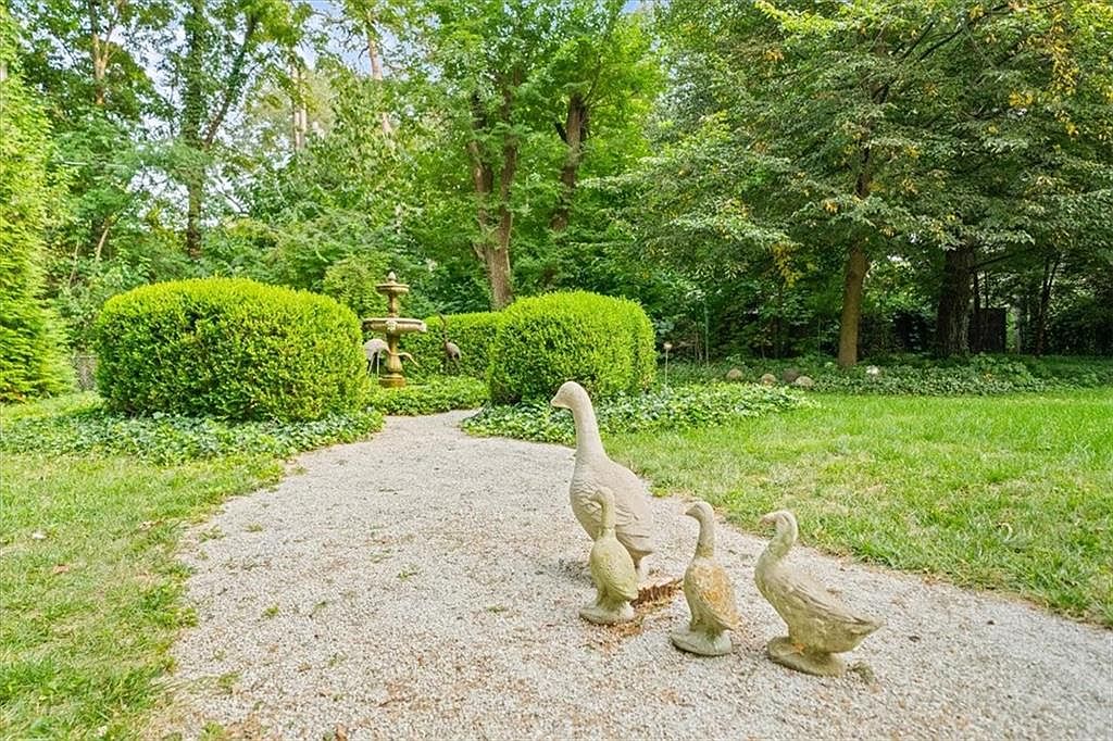 A charming gravel pathway leads through lush green lawns, bordered by well-manicured hedges and groundcover that evoke a serene, cottage-garden atmosphere. Stone duck sculptures add whimsical appeal, making this outdoor space inviting for families and children to explore and play. At the pathway’s end stands an elegant tiered fountain, the focal point of a tranquil seating nook surrounded by mature trees that offer ample shade and privacy. Natural textures and earthy tones harmonize with the landscape, while soft landscaping elements and the playful statuary create a warm, welcoming environment perfect for relaxation and family gatherings.