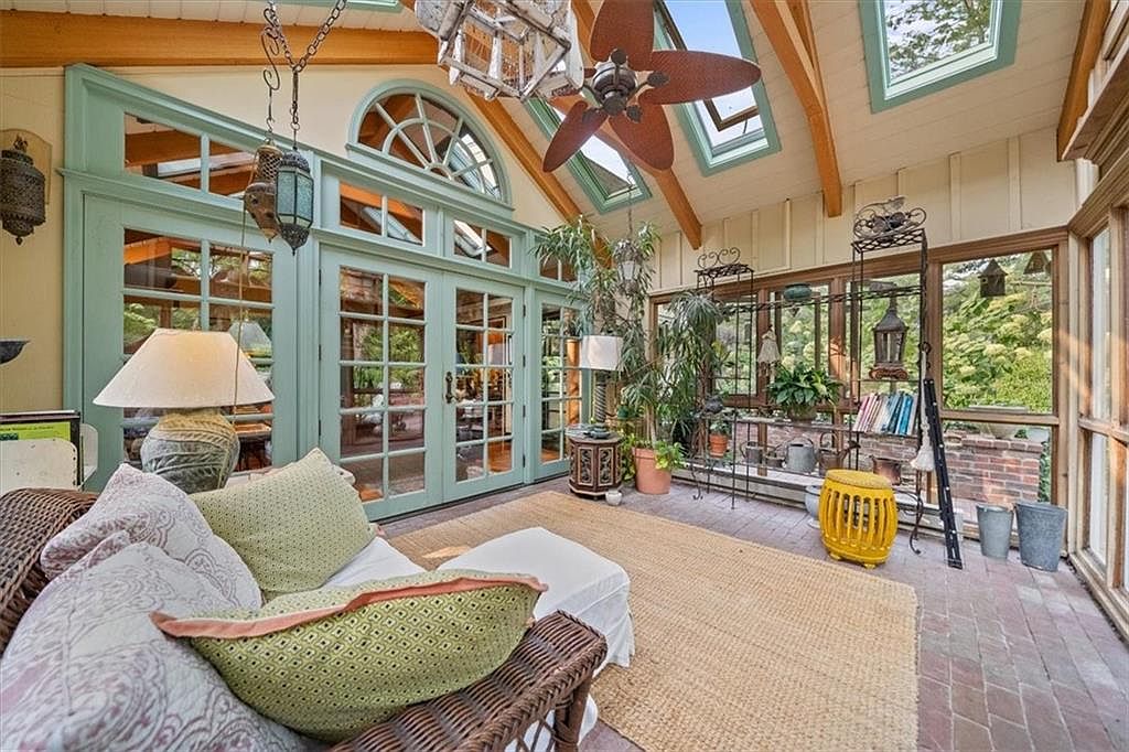 Airy and inviting, this sunroom features expansive windows and skylights that flood the space with natural light, creating a seamless connection to the outdoors. The palette combines soft greens on trim and doors with natural wood beams and neutral brick flooring, offering a relaxing ambiance. A wicker sofa with pastel cushions and cozy throws encourages family lounging, while the rug defines a central gathering area. Potted plants add vibrancy and a touch of nature, complemented by decorative lanterns and open shelving for books or family displays. The spacious layout is both functional and beautiful, ideal for casual family time or entertaining guests.