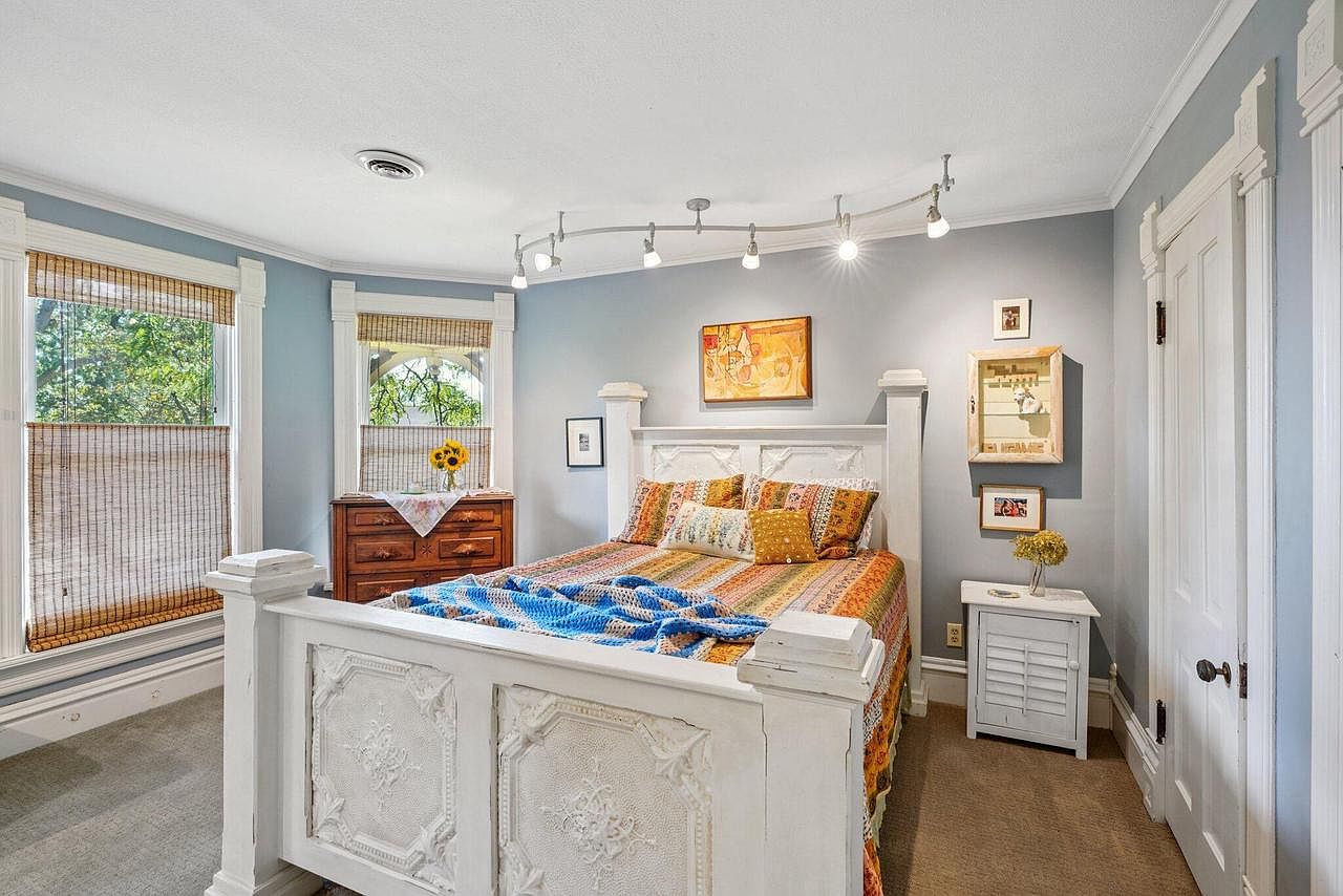 Sunlight pours into this charming bedroom through three large bay windows adorned with woven wood blinds, providing a cozy spot to wake up with a view of lush trees. The bed, layered with a colorful patchwork quilt and vibrant pillows, adds a playful and inviting touch, perfect for families. Walls painted in a soft neutral lend calmness, while artful prints above the vanity inject personality. A vintage wooden vanity with a round mirror anchors the room, complemented by original moldings and warm hardwood floors. Functional storage is provided by a tall dresser tucked neatly next to the bedroom’s open doorway.