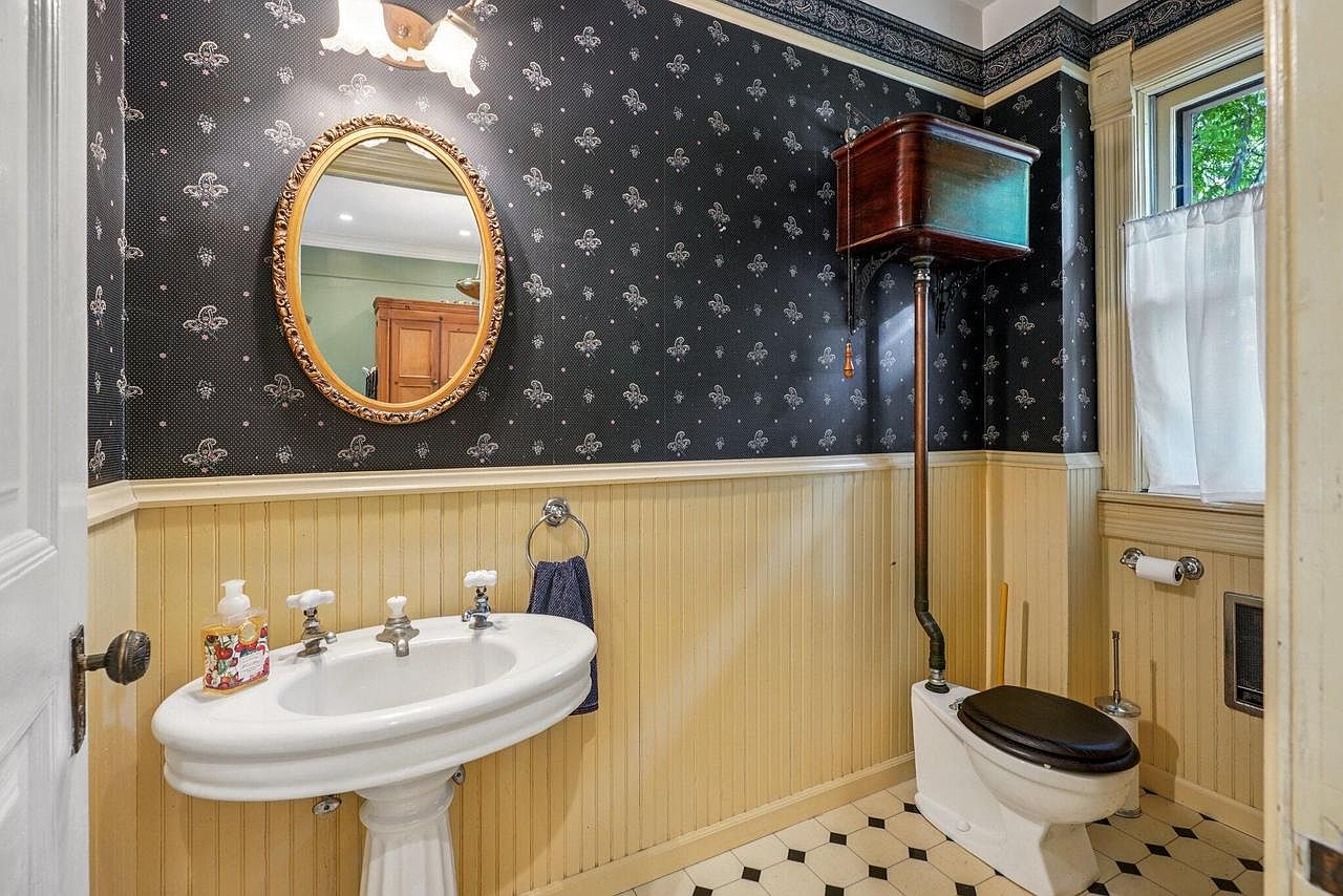 Showcasing a charming vintage-inspired bathroom, this space combines classic style with practical design. The black wallpaper adorned with delicate fleur-de-lis patterns contrasts beautifully against the warm cream beadboard wainscoting and trim. A pedestal sink with old-fashioned taps sits beneath a decorative oval mirror, adding elegance and a sense of history. The toilet features a unique high-tank design, evoking early American homes. The checkered tile flooring is both stylish and easy to clean, ideal for families. Soft natural light filters through a curtained window, creating a welcoming and cozy atmosphere for guests and residents alike.