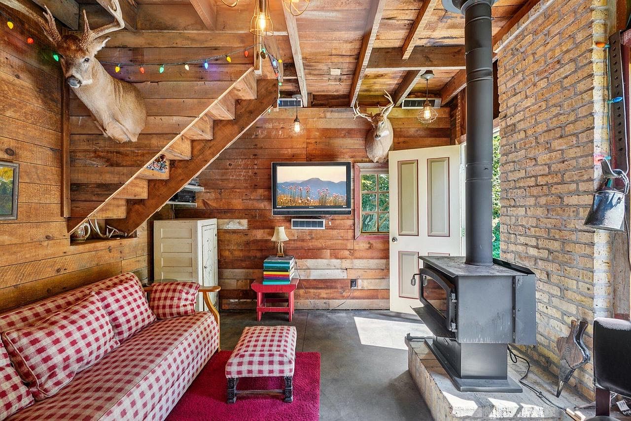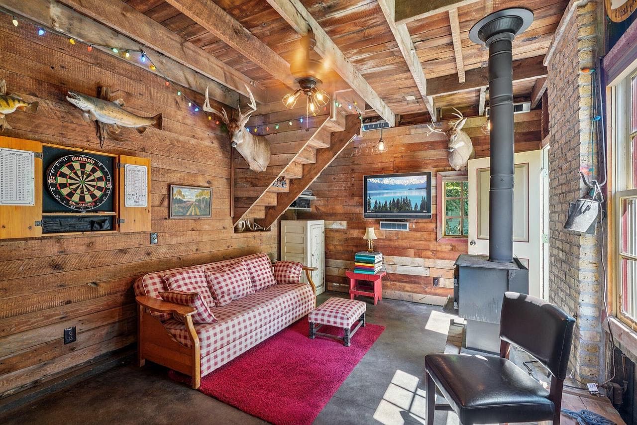 This cozy family room blends rustic charm with playful, inviting touches, making it perfect for gatherings. Natural wood paneling and exposed beams create a warm, lodge-like atmosphere, accented by mounted wildlife decor and string lights for a whimsical touch. The layout centers on a checkered sofa and matching ottoman, set atop a bright red rug that adds a lively pop of color. A wood-burning stove provides warmth, while abundant natural light streams through the windows. Entertainment options include a wall-mounted dartboard and television, ensuring fun for all ages. The compact staircase and eye-catching artwork complete the family-friendly space.