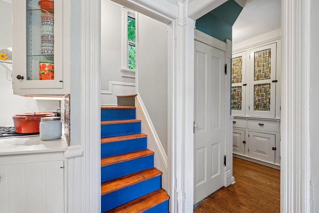 A charming transitional space blends a small stairway with vibrant blue risers and classic wood treads, leading natural light from the window above into the heart of the home. Crisp white walls and intricate trim work highlight the home’s traditional American design, creating a bright, open atmosphere ideal for families. To one side, glass-front cabinets display colorful kitchenware, while across the hall, built-in cabinetry with decorative glass doors offers ample storage for household essentials. Warm hardwood floors add comfort and durability, making this a practical yet inviting area for busy family routines or welcoming guests.