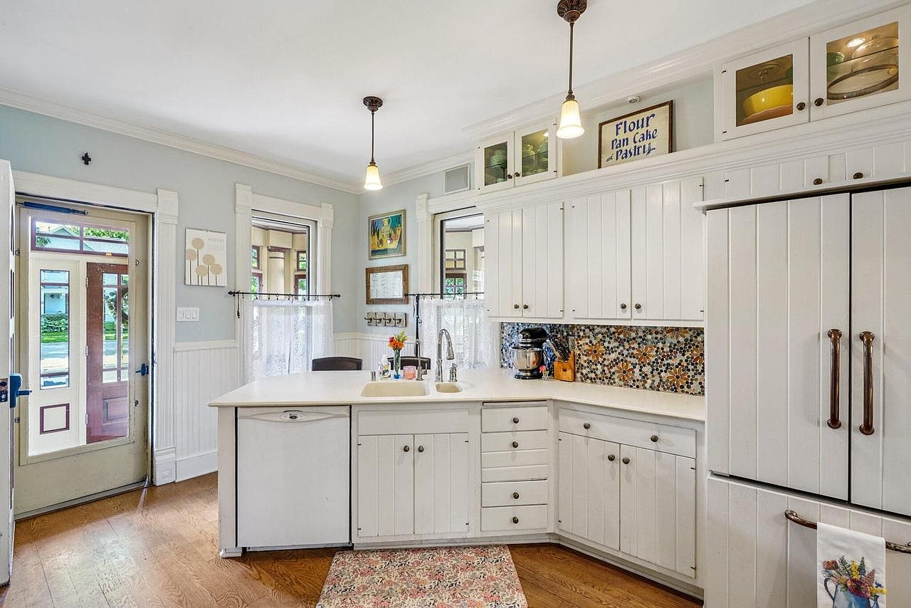 Bright and welcoming, this kitchen features white beadboard cabinetry and a wraparound counter with integrated sink, perfect for family meal prep and easy cleaning. The mosaic tile backsplash adds cheerful color, while glass-front upper cabinets provide a charming spot to display dishes. Warm wood floors and a patterned area rug bring a cozy feel, ideal for busy family mornings or casual gatherings. Ample storage space, a dishwasher for convenience, and a large double-door refrigerator make the layout functional and efficient. Natural light streams through large windows, enhanced by light blue walls and simple, cozy decor for a homey atmosphere.