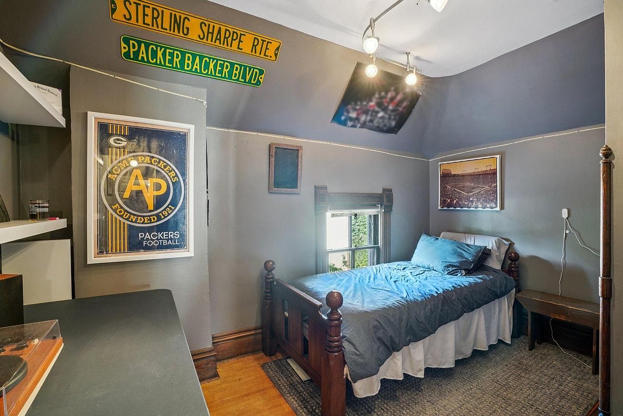 This cozy bedroom exudes personality with its dedicated sports theme, featuring memorabilia, wall art, and street sign decor that celebrates team spirit. The single bed with classic wooden posts is complemented by a soft blue comforter, adding a calming touch against the taupe-gray walls. A window brings natural light into the intimate space, while shelving and a practical desk area offer functionality for studying or hobbies. The angled ceiling and accent lighting add architectural character. Thoughtfully arranged, this bedroom is perfect for a young sports fan, combining comfort, inspiration, and family-friendly practicality in a compact setting.
