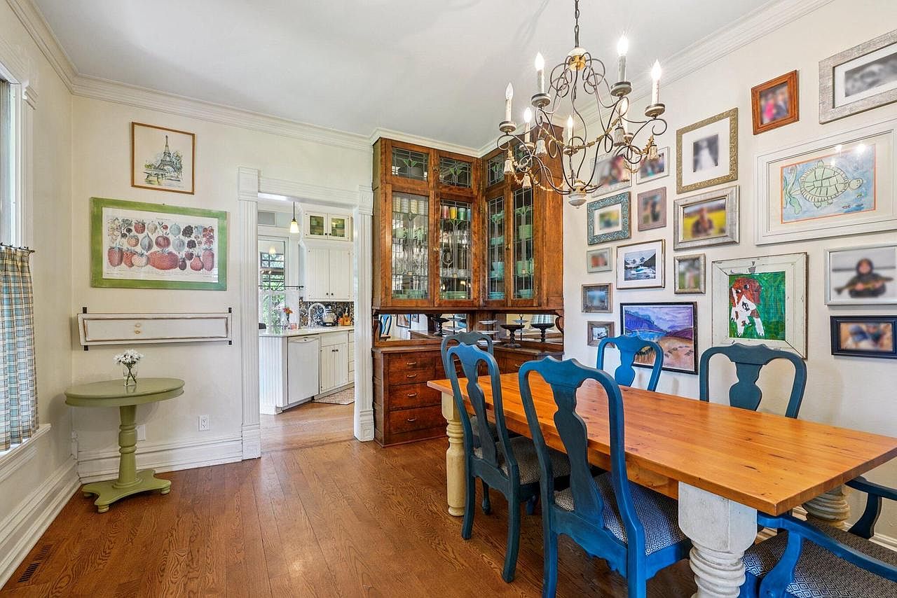 A bright and inviting dining room features a sturdy wooden table paired with blue-painted chairs, creating a welcoming space for family gatherings and meals. The rich wood floors complement the classic cabinetry, which showcases glass-paneled doors and ample storage, perfect for displaying cherished dishware. Walls are adorned with a playful mix of family photos, children’s artwork, and framed prints, adding warmth and personality. Crisp white trim and soft cream walls enhance the open and airy feel, while a rustic chandelier brings traditional elegance overhead. The room flows seamlessly into a white kitchen, ideal for family-friendly living and entertaining.