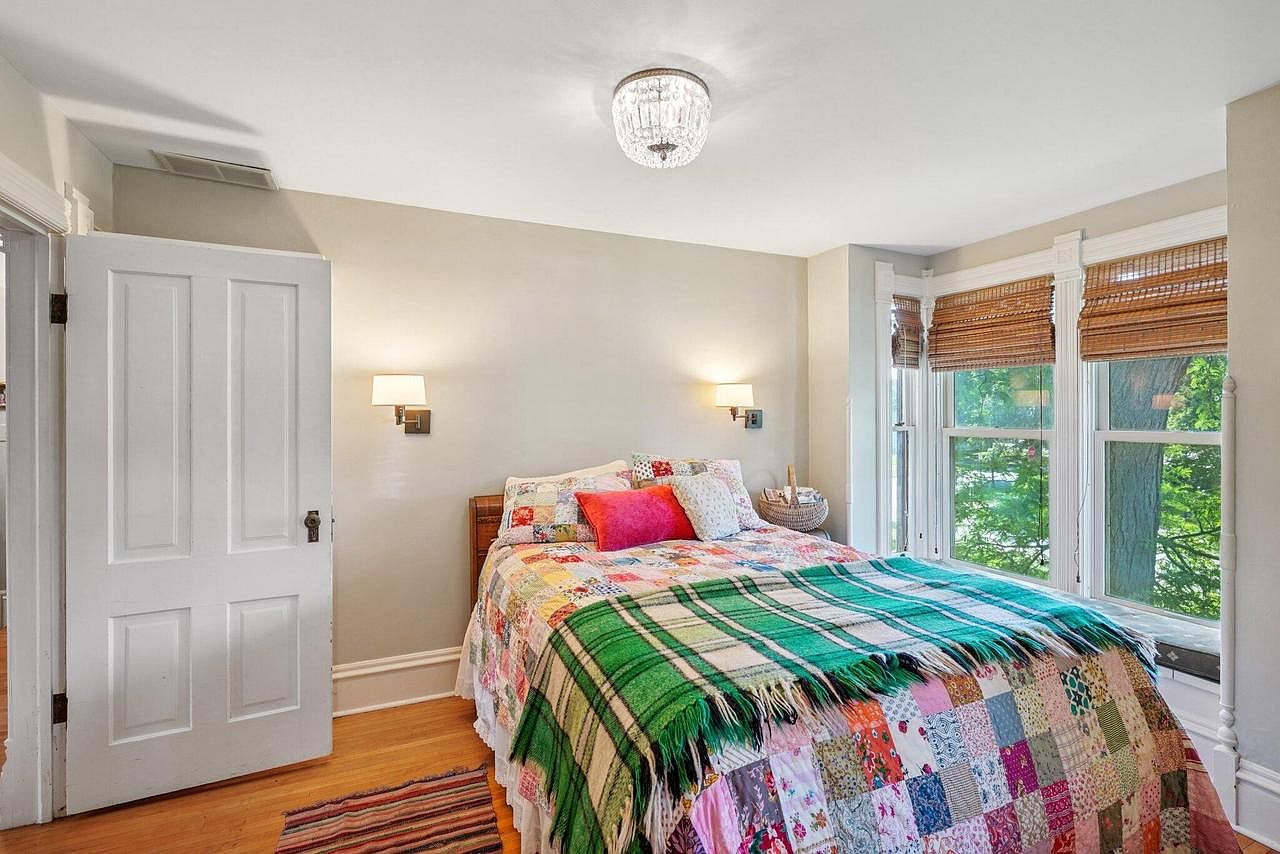 A cozy bedroom featuring a charming bay window that invites abundant natural light and provides a peaceful view of lush greenery outside. The room’s soothing neutral walls are complemented by warm hardwood floors and crisp white trim on the windows and door. A colorful patchwork quilt paired with a vibrant green blanket and an assortment of decorative pillows adds a playful, welcoming feel, perfect for families and guests. Woven blinds bring warmth and texture while maintaining privacy. The simple yet elegant lighting, including wall sconces and a crystal ceiling fixture, enhances the inviting ambiance of this restful, family-friendly retreat.